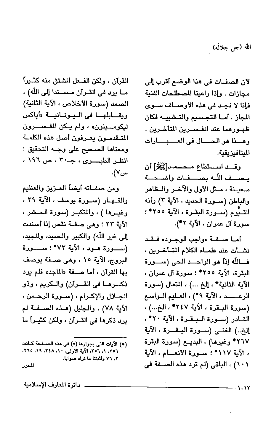 أما صفة "واجب الوجود" فقد نشأت عند علماء الكلام المتأخرين، فالله إذًا هو الواحد الحى (سورة البقرة، الآية 255 *؛ سورة آل عمران، الآية الثانية *، إلخ ... )، المتعال (سورة الرعد، الآية 9 *)، العليم الواسع (سورة البقرة، الآية 247 *، الخ ... )، القادر (سورة البقرة، الآية. 20 *، إلخ .. ) الغنى (سورة البقرة، الآية 267 وغير ها)، البديع (سورة البقرة، الآية 117 *؛ سورة الأنعام، الآية 101)، الباقى (لم ترد هذه الصفة فى القرآن، ولكن الفعل المشتق منه كثيرًا ما يرد فى القرآن مسندا إلى الله)، الصمد (سورة الإخلاص، الآية الثانية) ويقابلها فى اليونانية "أباكس ليكومينون "، ولم يكن المفسرون المتقدمون يعرفون أصل هذه الكلمة ومعناها الصحيح على وجه التحقيق؛ انظر الطبرى، جـ 30، ص 196, س 7).