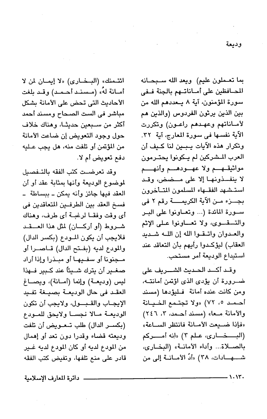 بِمَا تَعْمَلُونَ عَلِيمٌ} ويعد اللَّه سبحانه المحافظين على أماناتهم بالجنة ففى سورة المؤمنون، آية 8 يعددهم اللَّه من بين الذين يرثون الفردوس {وَالَّذِينَ هُمْ لِأَمَانَاتِهِمْ وَعَهْدِهِمْ رَاعُونَ} وتكررت الآية نفسها فى سورة المعارج، آية 32. وتكرار هذه الآيات يبين لنا كيف أن العرب المشركين لم يكونوا يحترمون مواثيقهم ولا عهودهم وأنهم لا ينفذونها إلا على مضض، وقد استشهد الفقهاء المسلمون المتأخرون بجزء من الآية الكريمة رقم 2 فى سورة المائدة {. . . وَتَعَاوَنُوا عَلَى الْبِرِّ وَالتَّقْوَى وَلَا تَعَاوَنُوا عَلَى الْإِثْمِ وَالْعُدْوَانِ وَاتَّقُوا اللَّهَ إِنَّ اللَّهَ شَدِيدُ الْعِقَابِ} ليؤكدوا رأيهم بأن التعاقد عند استيداع الوديعة أمر مستحب.