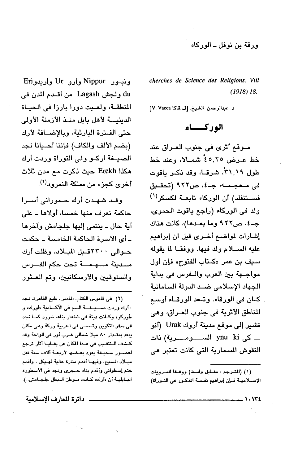(¬2) فى قاموس الكتاب المقدس، طبع القاهرة، نجد: أرك وردت صيغة السم فى الآكادية "أورك" و"أوركو" وكانت دينة فى شنعار بناها نمرود كما نجد فى سفر التكوين وتسمى فى العربية وركة وهى مكان يبعد بمقدار 80 ميلا شمالى غرب أور فى الواحة وقد كشف التنقيب فى هذا المكان عن بقايا آثار ترجع لعصور سحيقة يعود بعضها لأربعة آلاف سنة قبل ميلاد المسيح، وفيها أقدم منارة عالية لهيكل. وأقدم ختم إسطوانى وأقدم بناء حجرى ونجد فى الأسطورة البابلية أن "أرك" كانت موطن البطل جلجامش. .).