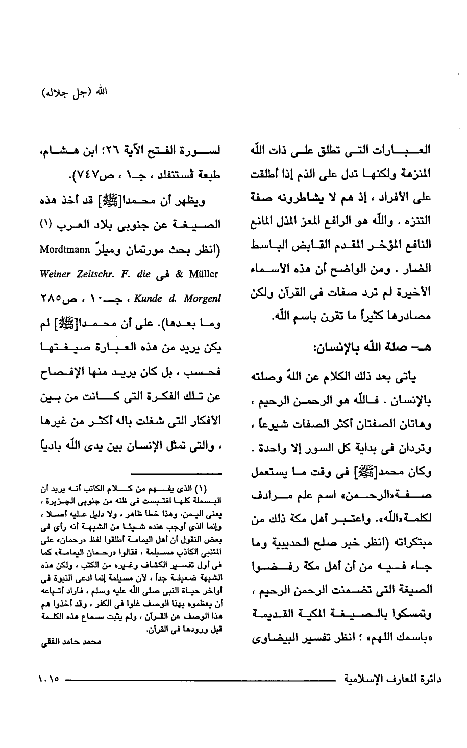 يأتى بعد ذلك الكلام عن الله وصلته بالإنسان. فالله هو الرحمن الرحيم، وهاتان الصفتان أكثر الصفات شيوعًا، وتردان فى بداية كل السور إلا واحدة. وكان محمدًا - صلى الله عليه وسلم - فى وقت ما يستعمل صفة "الرحمن" اسم علم مرادف لكلمة "الله". واعتبر أهل مكة ذلك من مبتكراته (انظر خبر صلح الحديبية وما جاء فيه من أن أهل مكة رفضوا الصيغة التى تضمنت الرحمن الرحيم، وتمسكوا بالصيغة المكية القديمة "باسمك اللهم"؛ انظر تفسير البيضاوى لسورة الفتح الآية 26؛ ابن هشام، طبعة فستنفلد، ج 1. ص 747).