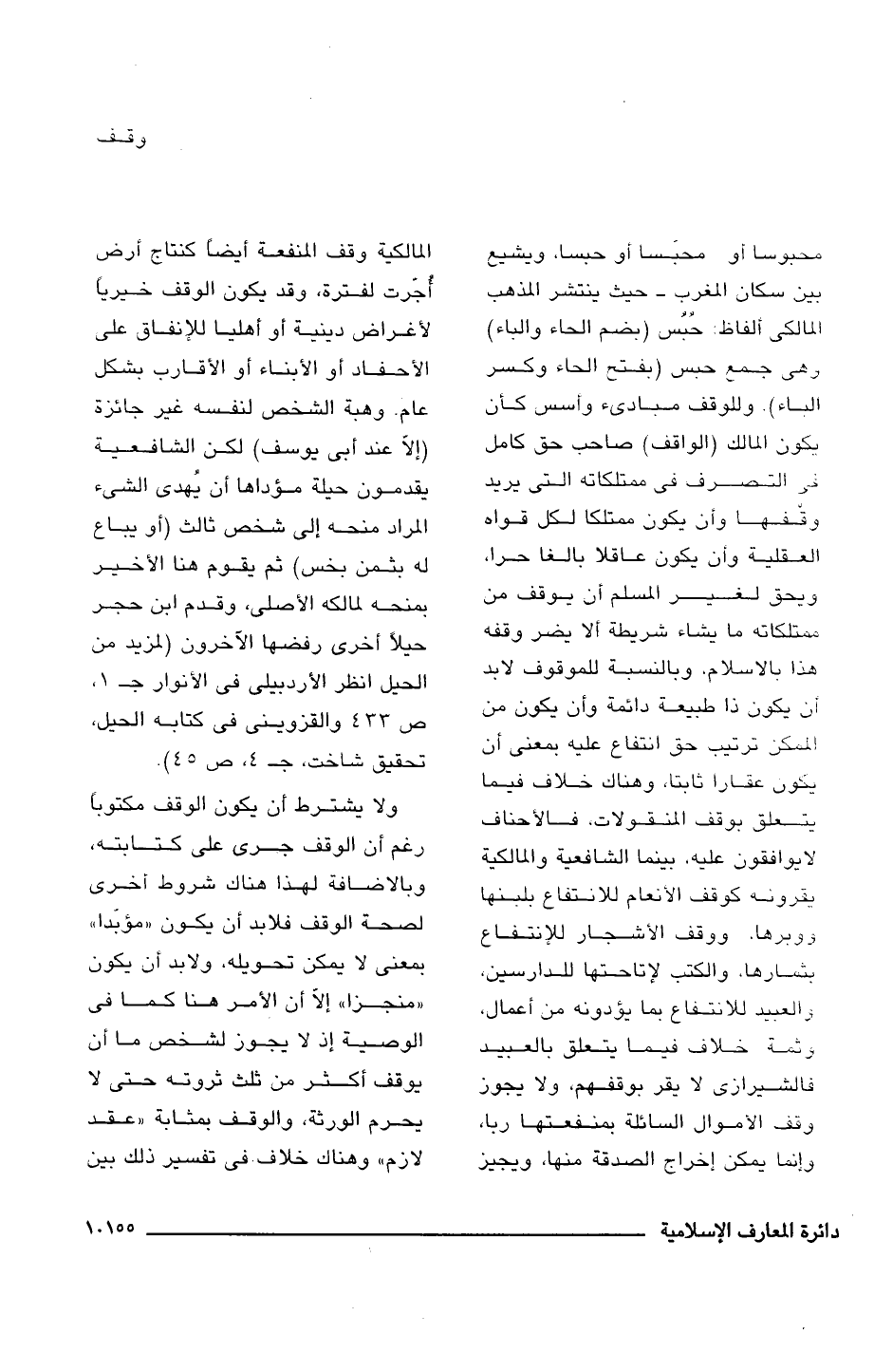 محبوسا أو محبّسا أو حبسا، ويشيع بين سكان المغرب -حيث ينتشر المذهب المالكى ألفاظ: حُبُس (بضم الحاء والباء) وهى جمع حبس (بفتح الحاء وكسر الحاء). وللوقف مبادئ وأسس كأن يكون المالك (الواقف) صاحب حق كامل فى التصرف فى ممتلكاته التى يريد وقفها وأن يكون ممتلكا لكل قواه العقلية وأن يكون عاقلا بالغا حرا، وبحق لغير المسلم أن يوقف من ممتلكاته ما يشاء شريطة ألا يضر وقفه هذا بالإسلام. وبالنسبة للموقوف لابد أن يكون ذا طبيعة دائمة وأن يكون من الممكن ترتيب حق انتفاع عليه بمعنى أن ينور عقارا ثابتا، وهناك خلاف فيما يتعلق بوقف المنقولات. فالأحناف لايوافقون عليه. بينما الشافعية والمالكية يقرونه كوقف الأنعام للانتفاع بلبنها ووبرها. ووقف الأشجار للإنتفاع بثمارها، والكتب لإتاحتها للدارسين، والعبيد للانتفاع بما يؤدونه من أعمال، وثمة خلاف فيما يتعلق بالعبيد فالشيرازى لا يقر بوقفهم، ولا يجوز وقف الأموال السائلة بمنفعتها ربا، وإنما يمكن إخراج الصدقة منها، ويجيز المالكية وقف المنفعة أيضًا كنتاج أرض أُجرت لفترة، وقد يكون الوقف خيريًا لأغراض دينية أو أهليا للإنفاق على الأحفاد أو الأبناء أو الأقارب بشكل عام. وهبة الشخص لنفسه غير جائزة (إلّا عند أبى يوسف) لكن الشافعية يقدمون حيلة مؤداها أن يُهدى الشئ المراد منحه إلى شخص ثالث (أو يباع له بثمن بخس) ثم يقوم هنا الأخير بمنحه لمالكه الأصلى، وقدم ابن حجر حيلًا أخرى رفضها الآخرون (لمزيد من الحيل انظر الأردبيلى فى الأنوار جـ 1، ص 433 والقزوينى فى كتابه الحيل، تحقيق شاخت، جـ 4، ص 45).