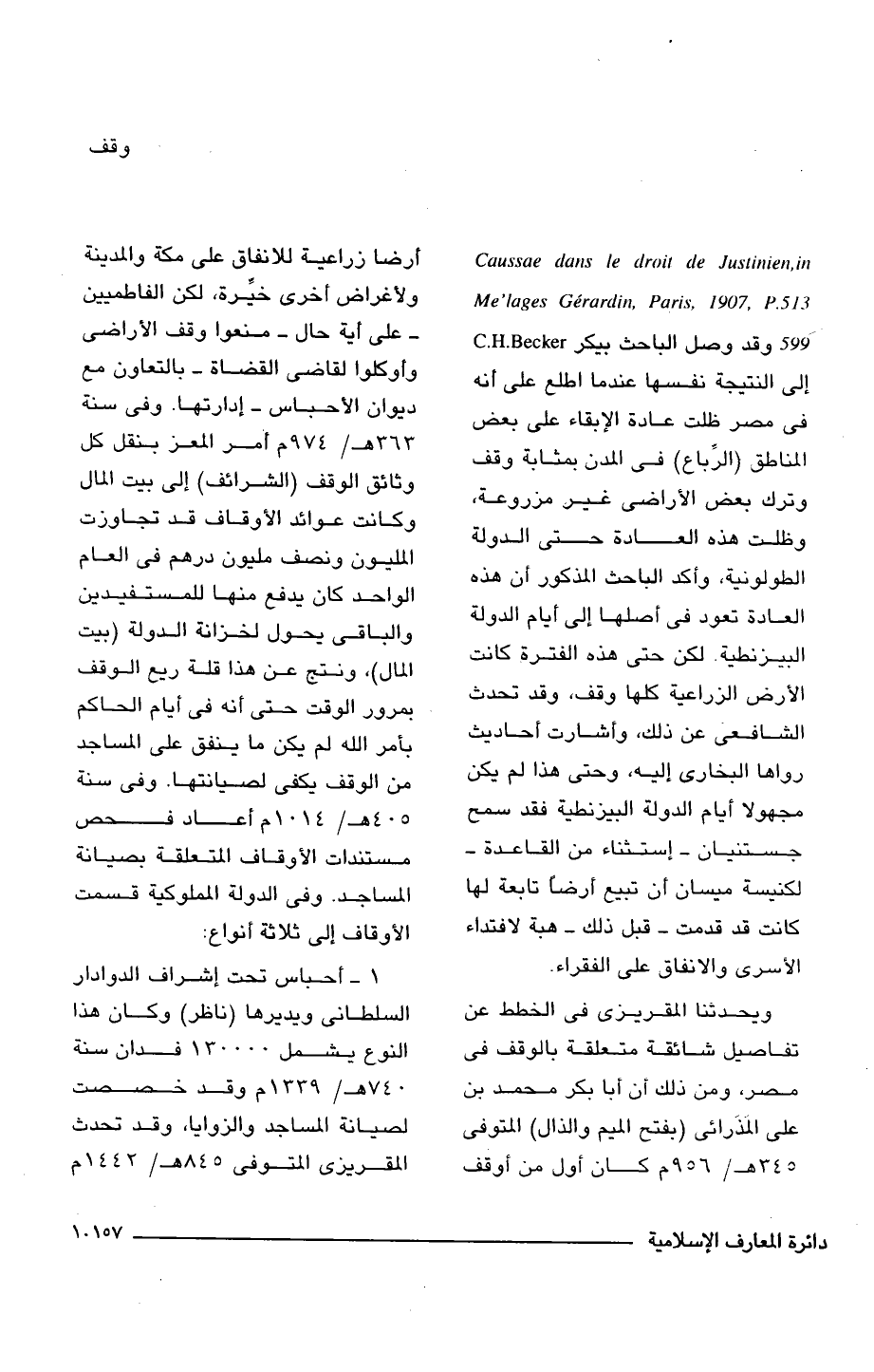 Caussae dans le droit de Juslinien,in Me'lages Gerardin, Paris, 1907. P.513 - 599 وقد وصل الباحث بيكر C.H.Becker إلى النتيجة نفسها عندما اطلع على أنه فى مصر ظلت عادة الإبقاء على بعض المناطق (الرِّباع) فى المدن بمثابة وقف وترك بعض الأراضى غير مزروعة، وظلت هذه العادة حتى الدولة الطولونية، وأكد الباحث المذكور أن هذه العادة تعود فى أصلها إلى أيام الدولة البيزنطية. لكن حتى هذه الفترة كانت الأرض الزراعية كلها وقف، وقد تحدث الشافعى عن ذلك، وأشارت أحاديث رواها البخارى إليه، وحتى هذا لم يكن مجهولا أيام الدولة البيزنطية فقد سمح جستنيان -إستثناء من القاعدة- لكنيسة ميسان أن تبيع أرضًا تابعة لها كانت قد قدمت -قبل ذلك- هبة لافتداء الأسرى والانفاق على الفقراء.