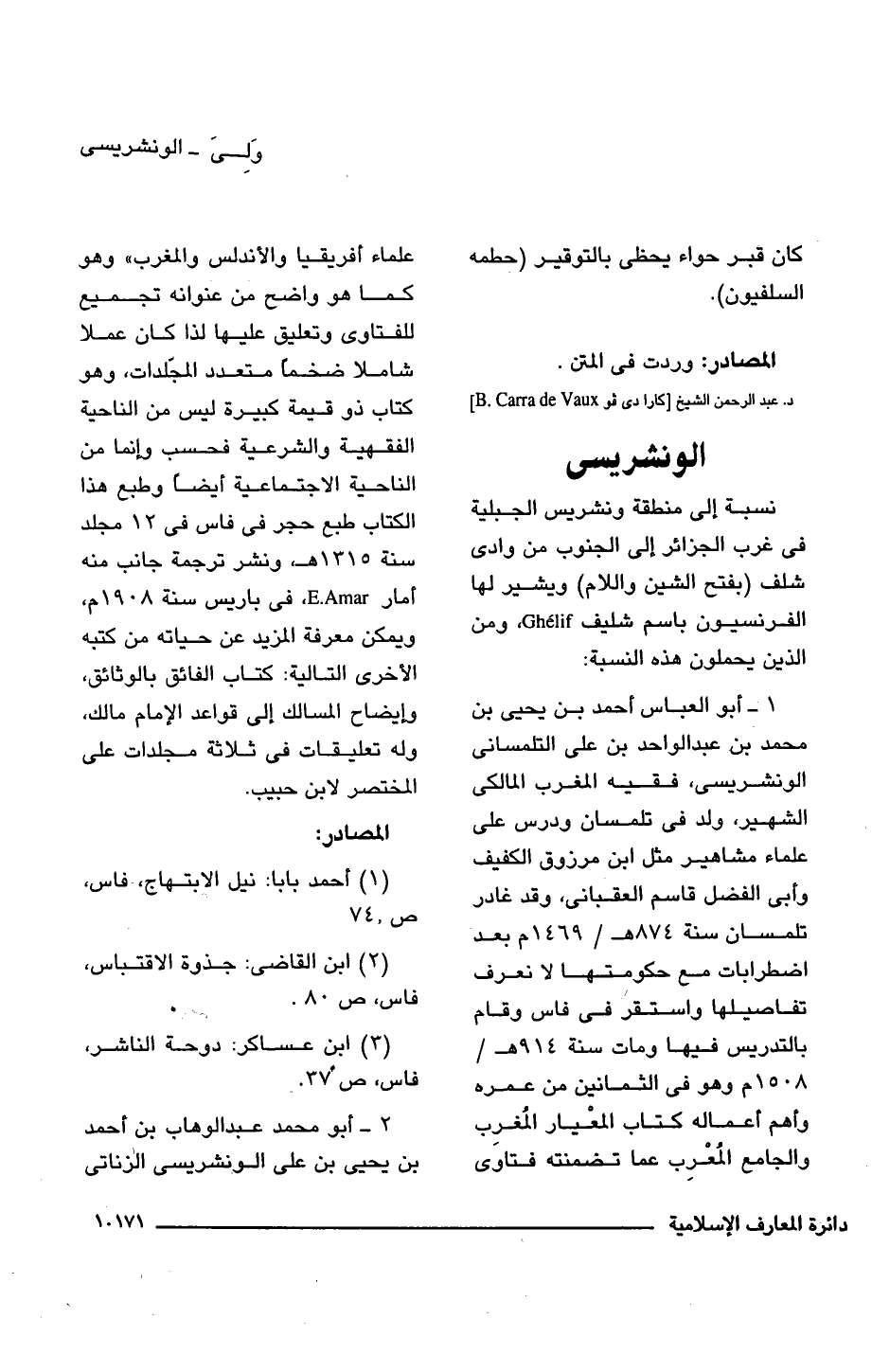 1 - أبو العباس أحمد بن يحيى بن محمد بن عبد الواحد بن على التلمسانى الونشريسى، فقيه المغرب المالكى الشهير، ولد فى تلمسان ودرس على علماء مشاهير مثل ابن مرزوق الكفيف وأبى الفضل قاسم العقبانى، وقد غادر تلمسان سنة 874 هـ/ 1469 م بعد اضطرابات مع حكومتها لا نعرف تفاصيلها واستقر فى فاس وقام بالتدريس فيها ومات سنة 914 هـ/ 1508 م وهو فى الثمانين من عمره وأهم أعماله كتاب المعيار المُغرب والجامع المُعْرِب عما تصمنته فتاوى علماء أفريقيا والأندلس والمغرب" وهو كما هو واضح من عنوانه تجميع للفتاوى وتعليق عليها لذا كان عملا شاملا ضخمًا متعدد المجلدات، وهو كتاب ذو قيمة كبيرة ليس من الناحية الفقهية والشرعية فحسب وإنما من الناحية الاجتماعية أيضًا وطبع هذا الكتاب طبع حجر فى فاس فى 12 مجلد سنة 1315 هـ، ونشر ترجمة جانب منه أمار E.Amar، فى باريس سنة 1908 م، ويمكن معرفة المزيد عن حياته من كتبه الأخرى التالية: كتاب الفائق بالوثائق، وإيضاح المسالك إلى قواعد الإمام مالك، وله تعليقات فى ثلاثة مجلدات على المختصر لابن حبيب.