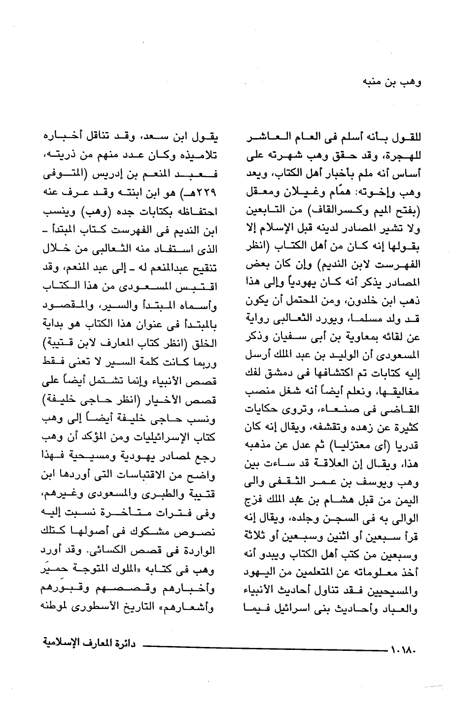 للقول بأنه أسلم فى العام العاشر للهجرة، وقد حقق وهب شهرته على أساس أنه ملم بأخبار أهل الكتاب، ويعد وهب وإخوته: همّام وغيلان ومعقل (بفتح الميم وكسر القاف) من التابعين ولا تشير المصادر لدينه قبل الإسلام إلا بقولها إنه كان من أهل الكتاب (انظر الفهرست لابن النديم) وإن كان بعض المصادر يذكر أنه كان يهوديًا وإلى هذا ذهب ابن خلدون، ومن المحتمل أن يكون قد ولد مسلما، ويورد الثعالبى رواية عن لقائه بمعاوية بن أبى سفيان وذكر المسعودى أن الوليد بن عبد الملك أرسل إليه كتابات تم اكتشافها فى دمشق لفك مغاليقها، ونعلم أيضًا أنه شغل منصب القاضى فى صنعاء، وتروى حكايات كثيرة عن زهده وتقشفه، ويقال إنه كان قدريا (أى معتزليا) ثم عدل عن مذهبه هذا، ويقال إن العلاقة قد ساءت بين وهب ويوسف بن عمر الثقفى والى اليمن من قبل هشام بن عبد الملك فزج الوالى به فى السجن وجلده، ويقال إنه قرأ سبعين أو اثنين وسبعين أو ثلاثة وسبعين من كتب أهل الكتاب ويبدو أنه أخذ معلوماته عن المتعلمين من اليهود والمسيحيين فقد تناول أحاديث الأنبياء والعباد وأحاديث بنى اسرائيل فيما يقول ابن سعد، وقد تناقل أخباره تلاميذه وكان عدد منهم من ذريته، فعبد المنعم بن إدريس (المتوفى 229 هـ) هو ابن ابنته وقد عرف عنه احتفاظه بكتابات جده (وهب) وينسب ابن النديم فى الفهرست كتاب المبتدأ -الذى استفاد منه الثعالبى من خلال تنقيح عبد المنعم له- إلى عبد المنعم، وقد اقتبس المسعودى من هذا الكتاب وأسماه المبتدأ والسير، والمقصود بالمبتدأ فى عنوان هذا الكتاب هو بداية الخلق (انظر كتاب المعارف لابن قتيبة) وربما كانت كلمة السير لا تعنى فقط قصص الأنبياء وإنما تشتمل أيضًا على قصص الأخيار (انظر حاجى خليفة) ونسب حاجى خليفة أيضًا إلى وهب كتاب الإسرائيليات ومن المؤكد أن وهب رجع لمصادر يهودية ومسيحية فهذا واضح من الاقتباسات التى أوردها ابن قتيبة والطبرى والمسعودى وغيرهم، وفى فترات متأخرة نسبت إليه نصوص مشكوك فى أصولها كتلك الواردة فى قصص الكسائى. وقد أورد وهب فى كتابه "الملوك المتوجة حِميَر وأخبارهم وقصصهم وقبورهم وأشعارهم" التاريخ الأسطورى لموطنه