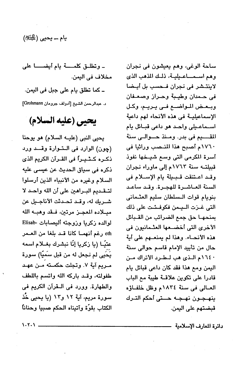 ساحة الوغى، وهم يعيشون فى نجران وهم اسماعيلية، ذلك المذهب الذى لا ينتشر فى نجران فحسب بل أيضًا فى حمدان وطيبة وحراز وصعفان وبعض المواضع فى يريم، وكل الإسماعيلية فى هذه الأنحاء لهم داعية اسماعيلى واحد هو داعى قبائل يام المقيم فى بدر. ومنذ حوالى سنة 1760 م أصبح هذا المنصب وراثيا فى أسرة المكرمى التى وسع شيخها نفوذ قبيلته سنة 1763 م إلى ما وراء نجران وقد اعتنقت قبيلة يام الإسلام فى السنة العاشرة للهجرة. وقد ساعد بنو يام قوات السلطان سليم العثمانى التى غزت اليمن فكوفئت على ذلك بمنحها حق جمع الضرائب من القبائل الأخرى التى أخضعها العثمانيون فى هذه الأنحاء. وهذا لم يمنعهم على أية حال من تأييد الإمام قاسم حوالى سنة 1640 م الذى هب لطرد الأتراك من اليمن ومع هذا فقد كان داعى قبائل يام قادرا على تكوين علاقة طيبة مع الباب العالى فى سنة 1834 م وظل خلفاؤه ينهجون نهجه حتى أحكم الترك قبضتهم على اليمن.
