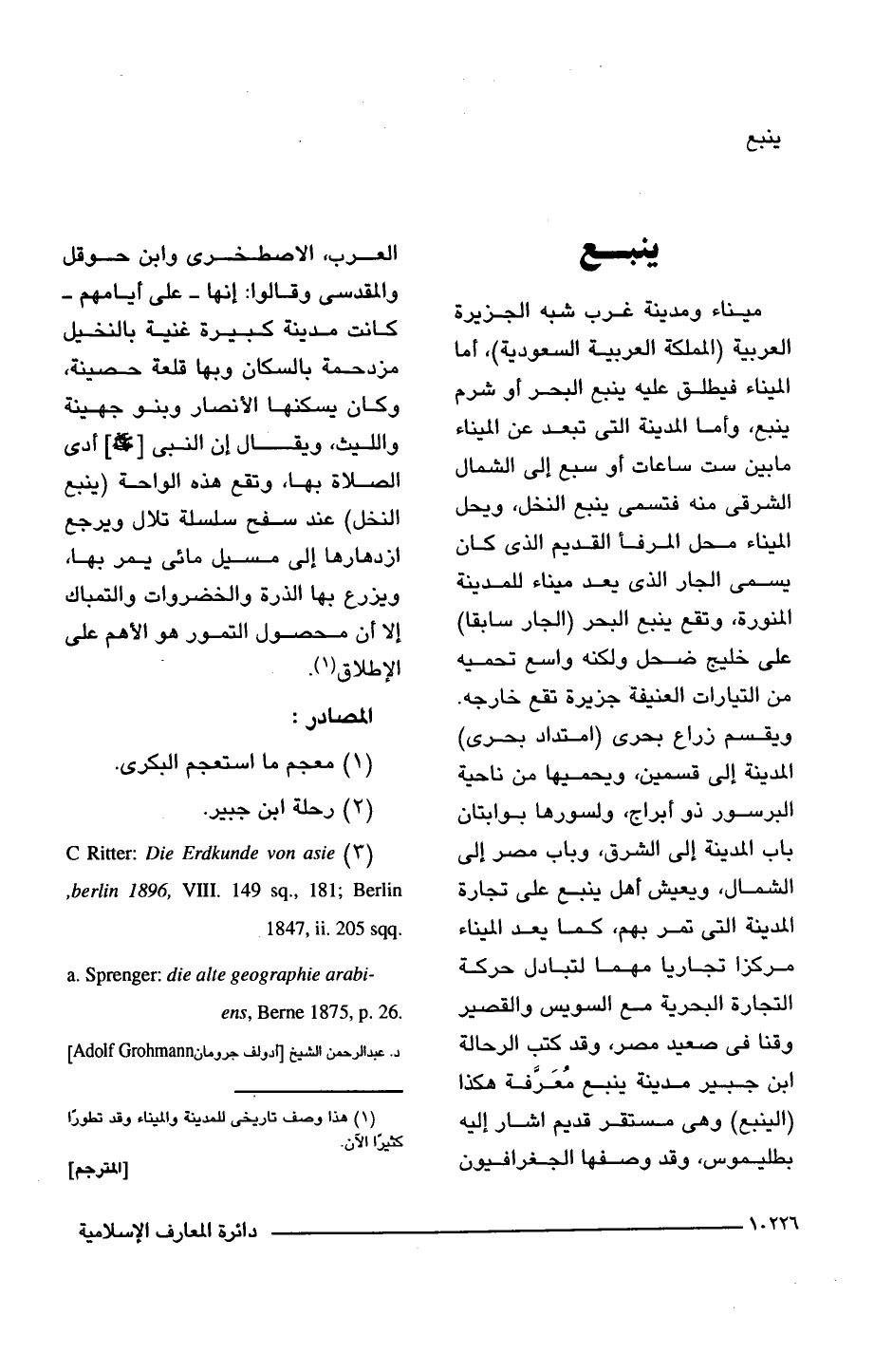 ميناء ومدينة غرب شبه الجزيرة العربية (المملكة العربية السعودية)، أما الميناء فيطلق عليه ينبع البحر أو شرم ينبع، وأما المدينة التى تبعد عن الميناء ما بين ست ساعات أو سبع إلى الشمال الشرقى منه فتسمى ينبع النخل، ويحل الميناء محل المرفأ القديم الذى كان يسمى الجار الذى يعد ميناء للمدينة المنورة، وتقع ينبع البحر (الجار سابقًا) على خليج ضحل ولكنه واسع تحميه من التيارات العنيفة جزيرة تقع خارجه. ويقسم زراع بحرى (امتداد بحرى) المدينة إلى قسمين، ويحميها من ناحية البرسور ذو أبراج، ولسورها بوابتان باب المدينة إلى الشرق، وباب مصر إلى الشمال، ويعيش أهل ينبع على تجارة المدينة التى تمر بهم، كما يعد الميناء مركزا تجاريا مهما لتبادل حركة التجارة البحرية مع السويس والقصير وقنا فى صعيد مصر، وقد كتب الرحالة ابن جبير مدينة ينبع مُعَرَّفة هكذا (الينبع) وهى مستقر قديم أشار إليه بطليموس، وقد وصفها الجغرافيون العرب، الاصطخرى وابن حوقل والمقدسى وقالوا: إنها -على أيامهم- كانت مدينة كبيرة غنية بالنخيل مزدحمة بالسكان وبها قلعة حصينة، وكان يسكنها الأنصار وبنو جهينة والليث، ويقال إن النبى [-صلى اللَّه عليه وسلم-] أدى الصلاة بها، وتقع هذه الواحة (ينبع النخل) عند سفح سلسلة تلال ويرجع ازدهارها إلى مسيل مائى يمر بها، ويزرع بها الذرة والخضروات والتمباك إلا أن محصول التمور هو الأهم على الإطلاق (¬1).