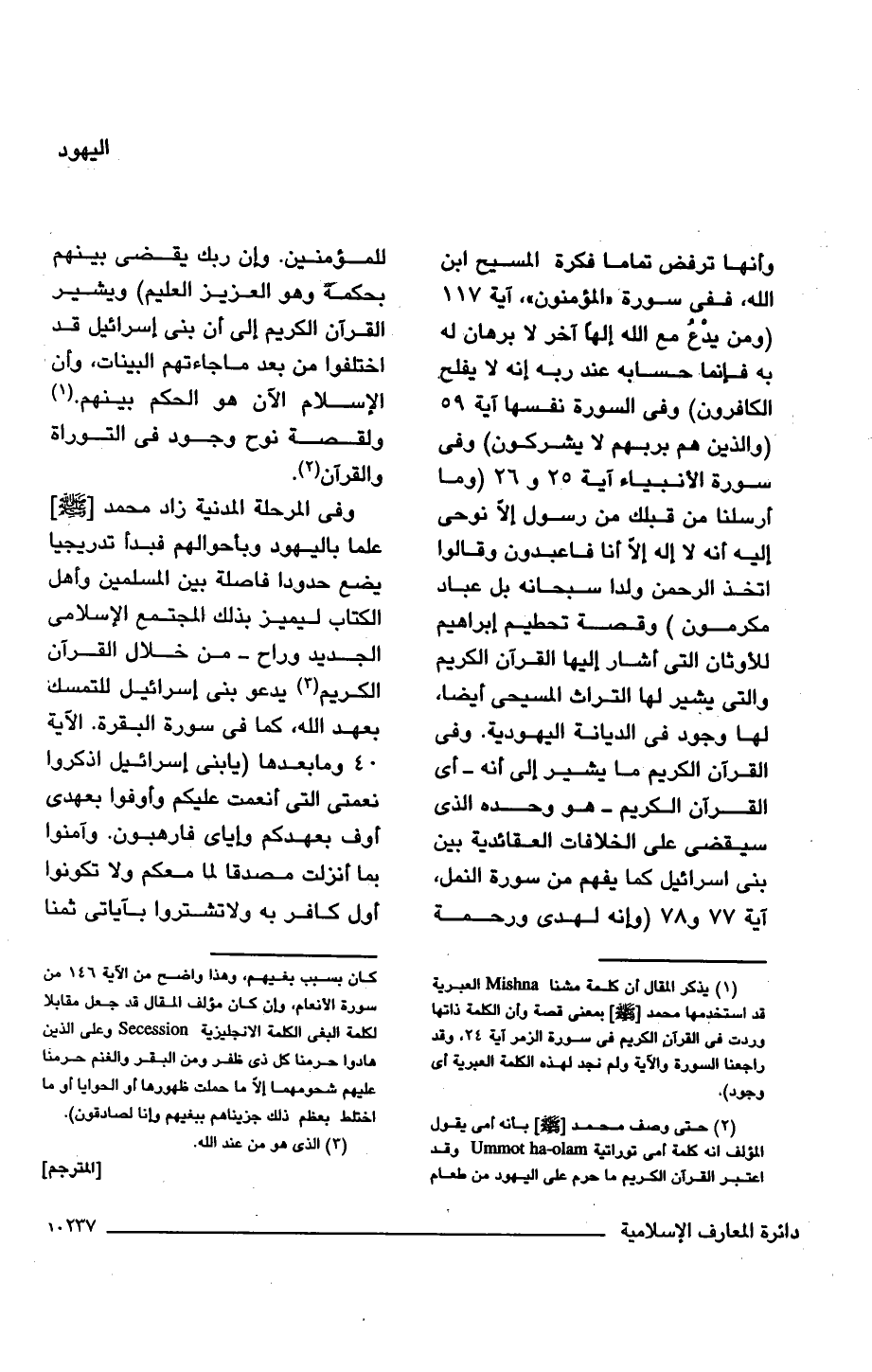 (¬1) يذكر المقال أن كلمة مشنا Mishna العبرية قد استخدمها محمد [-صلى اللَّه عليه وسلم-] بمعنى قصة وأن الكلمة ذاتها وردت فى القرآن الكريم فى سورة الزمر آية 24، وقد راجعنا السورة والآية ولم نجد لهذه الكلمة العبرية أى وجود).