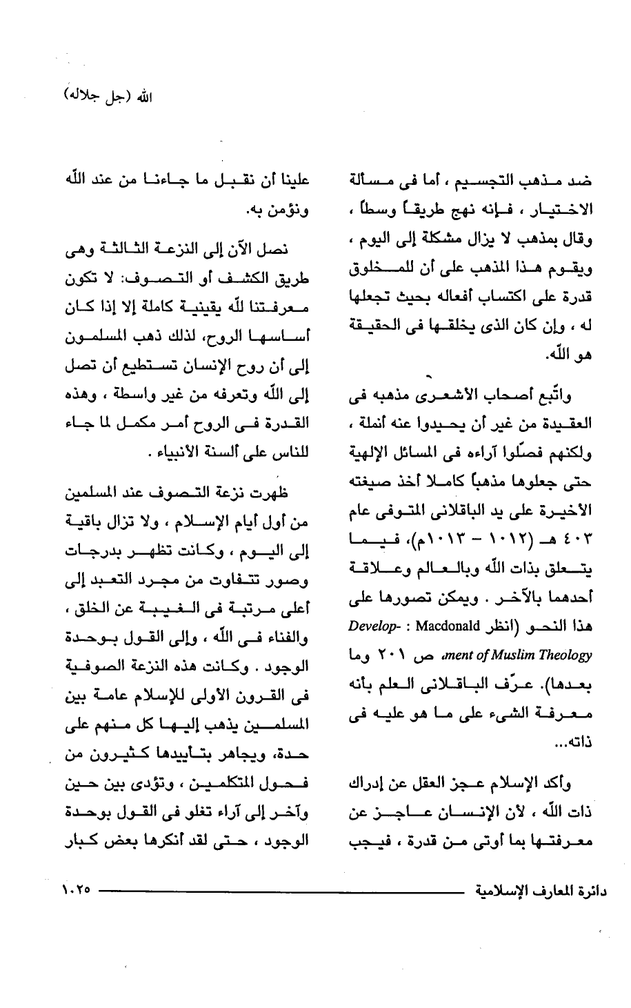 واتّبع أصحاب الأشعرى مذهبه فى العقيدة من غير أن يحيدوا عنه أنملة، ولكنهم فصَلوا آراءه فى المسائل الإلهية حتى جعلوها مذهبًا كاملًا أخذ صيغته الأخيرة على يد الباقلانى المتوفى عام 403 هـ (1012 - 1013 م)، فيما يتعلق بذات الله وبالعالم وعلاقة أحدهما بالآخر. ويمكن تصورها على هذا النحو (انظر Develop-: Macdonald ment of Muslim Theology ص 201 وما بعدها). عرّف الباقلانى العلم بأنه معرفة الشيء على ما هو عليه فى ذاته ...