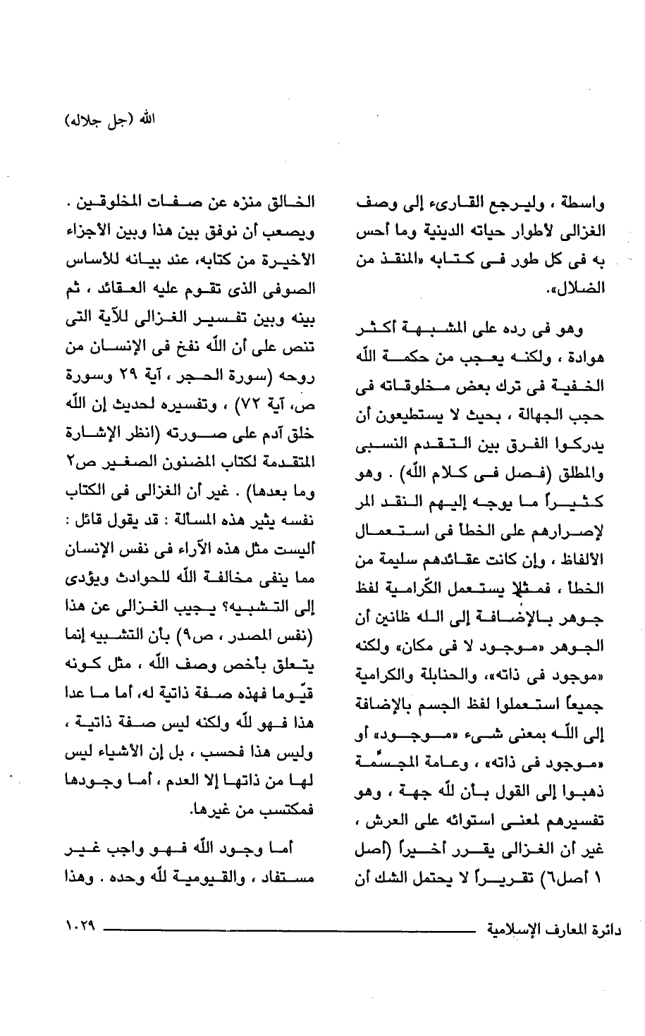 وهو فى رده على المشبهة أكثر هوادة، ولكنه يعجب من حكمة الله الخفية فى ترك بعض مخلوقاته فى حجب الجهالة، بحيث لا يستطيعون أن يدركوا الفرق بين التقدم النسبى والمطلق (فصل فى كلام الله). وهو كثيرًا ما يوجه إليهم النقد المر لإصرارهم على الخطأ فى استعمال الألفاظ، وإن كانت عقائدهم سليمة من الخطأ، فمثلًا يستعمل الكّرامية لفظ جوهر بالإضافة إلى الله ظانين أن الجوهر "موجود لا فى مكان" ولكنه "موجود فى ذاته"، والحنابلة والكرامية جميعًا استعملوا لفظ الجسم بالإضافة إلى الله بمعنى شئ "موجود" أو "موجود فى ذاته"، وعامة المجسَّمة ذهبوا إلى القول بأن لله جهة، وهو تفسيرهم لمعنى استوائه على العرش، غير أن الغزالى يقرر أخيرًا (أصل 1 أصل 6) تقريرًا لا يحتمل الشك أن الخالق منزه عن صفات المخلوقين. ويصعب أن نوفق بين هذا وبين الأجزاء الأخيرة من كتابه، عند بيانه للأساس الصوفى الذى تقوم عليه العقائد، ثم بينه وبين تفسير الغزالى للآية التى تنص على أن الله نفخ فى الإنسان من روحه (سورة الحجر، آية 29 وسورة ص، آية 72)، وتفسيره لحديث إن الله خلق آدم على صورته (انظر الإشارة المتقدمة لكتاب المضنون الصغير ص 2 وما بعدها). غير أن الغزالى فى الكتاب نفسه يثير هذه المسألة: قد يقول قائل: أليست مثل هذه الآراء فى نفس الإنسان مما ينفى مخالفة الله للحوادث ويؤدى إلى التشبيه؛ يجيب الغزالى عن هذا إنفس المصدر، ص 9) بأن التشبيه إنما يتعلق بأخص وصف الله، مثل كونه قيومًا فهذه صفة ذاتية له، أما ما عدا هذا فهو لله ولكنه ليس صفة ذاتية، وليس هذا فحسب، بل إن الأشياء ليس لها من ذاتها إلا العدم، أما وجودها فمكتسب من غيرها.