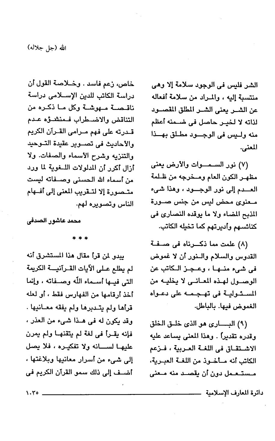 (9) البارى هو الذى خلق الخلق وقدره تقديرًا. وهذا المعنى يساعد عليه الاشتقاق فى اللغة العربية، فزعم الكاتب أنه مأخوذ من اللغة العبرية، مستعمل دون أن يقصد منه معنى خاص، زعم فاسد. وخلاصة القول أن دراسة الكاتب للدين الإسلامى دراسة ناقصة مهوشة وكل ما ذكره من التناقض والاضطراب فمنشؤه عدم قدرته على فهم مرامى القرآن الكريم والأحاديث فى تصوير عقيدة التوحيد والتنزيه وشرح الأسماء والصفات. ولا أزال أكرر أن المدلولات اللغوية لما ورد من أسماء الله الحسنى وصفاته ليست متصورة إلا لتقريب المعنى إلى أفهام الناس وتصويره لهم.