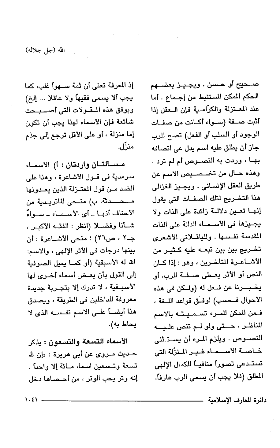 صحيح أو حسن. ويجيز بعضهم الحكم الممكن المستنبط من إجماع. أما عند المعتزلة والكرّامية فإن العقل إذا أثبت صفة (سواء أكانت من صفات الوجود أو السلب أو الفعل) تصح للرب جاز أن يطلق عليه اسم يدل عى اتصافه بها، وردت به النصوص أم لم ترد. وهذه حال من تخصيص الاسم عن طريق العقل الإنسانى. ويجيز الغزالى هذا التخريج لتلك الصفات التى يقول إنها تعين دلالة زائدة على الذات ولا يجيزها فى الأسماء الدالة على الذات المقدسة نفسها. وللباقلانى الأشعرى تخريج بين بين تبعه عليه كثير من الأشاعرة المتأخرين، وهو: إذا كان النص أو الأثر يعطى صفة للرب، أو يخبرنا عن فعل له (ولكن فى هذه الأحوال فحسب) لوفق قواعد اللغة، فمن الممكن للمرء تسميته بالاسم المناظر، حتى ولو لم تنص عليه النصوص. ويلزم المرء أن يستثنى خاصة الأسماء غير المنزّلة التى تستدعى تصوراً منافياً للكمال الإلهى المطلق (فلا يجب أن يسمى الرب عارفاً، إذ المعرفة تعنى أن ثمة سهواً غلب، كما يجب ألا يسمى فقيهاً ولا عاقلا. . . إلخ) وبوفق هذه المقولات التى أصبحت شائعة فإن الأسماء لهذا يجب أن تكون إما منزلة، أو على الأقل ترجع إلى جذم منزل.