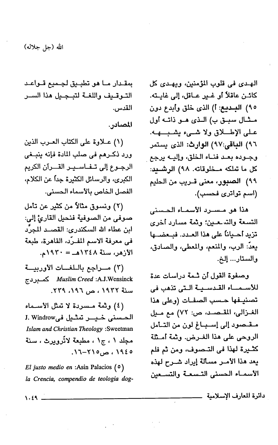 (1) علاوة على الكتاب العرب الذين ورد ذكرهم فى صلب المادة فإنَّه ينبغى الرجوع إلى تفاسير القرآن الكريم الكبرى، والرسائل الكثيرة جداً عن الكلام، الفصل الخاص بالأسماء الحسنى.
