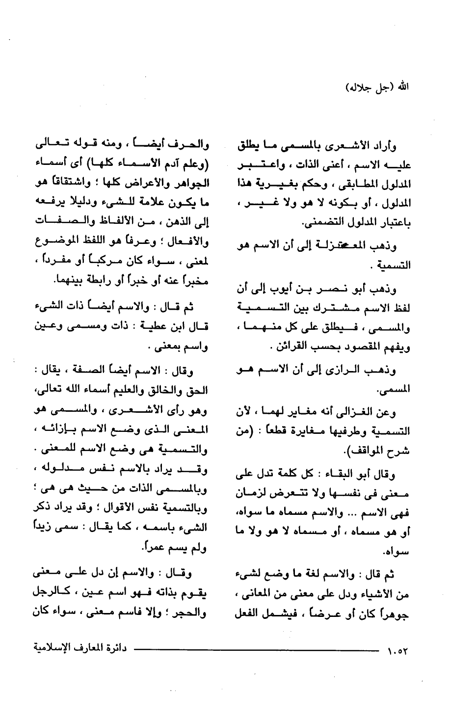 وقال: الاسم أيضاً الصفة، يقال: الحق والخالق والعليم أسماء الله تعالى، وهو رأى الأشعرى، والمسمى هو المعنى الذى وضع الاسم بإزائه، والتسمية هى وضع الاسم للمعنى. وقد يراد بالاسم نفس مدلوله، وبالمسمى الذات من حيث هى هى؛ وبالتسمية نفس الأقوال؛ وقد يراد ذكر الشئ باسمه، كما يقال: سمى زيداً ولم يسم عمراً.