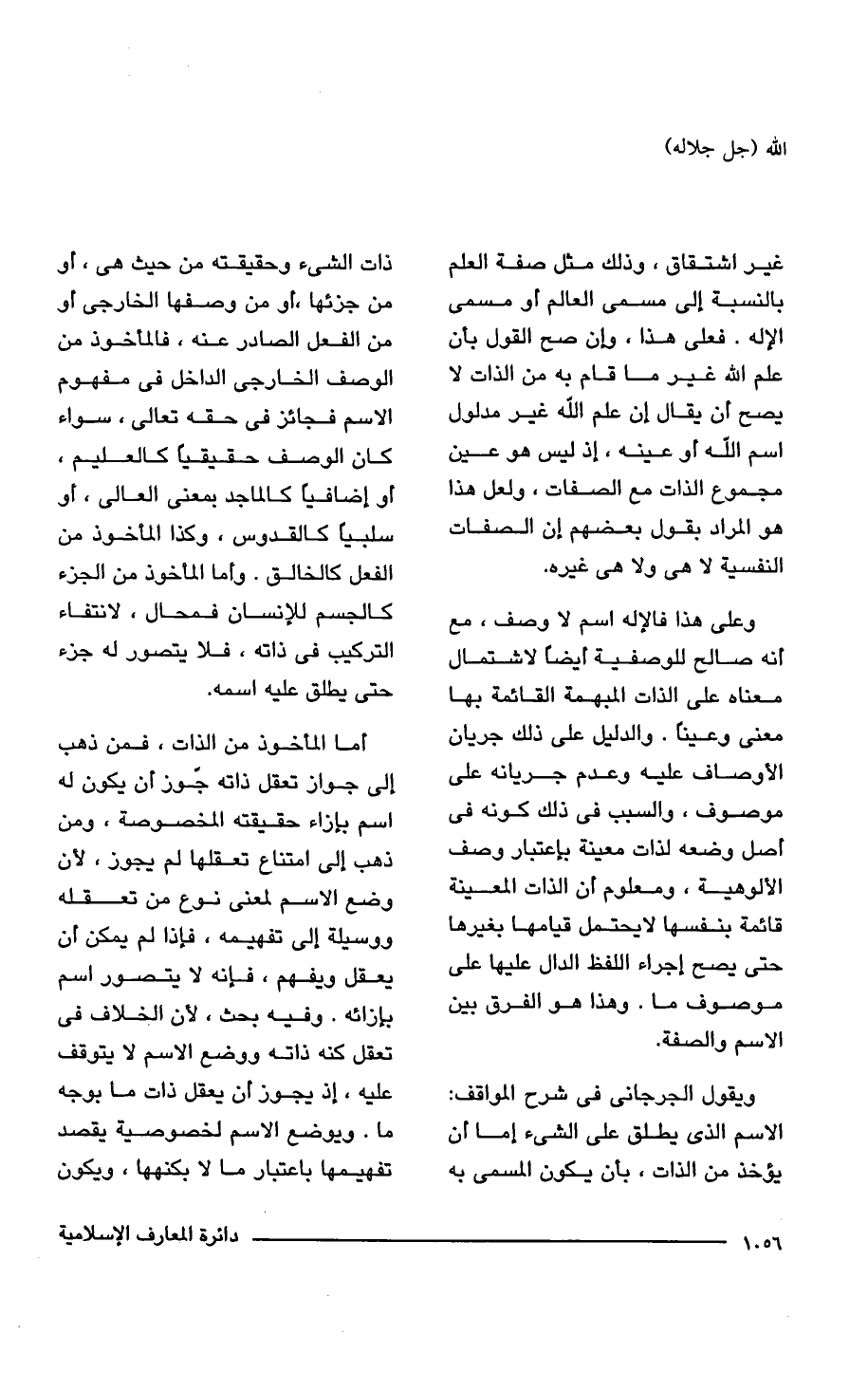 ويقول الجرجانى فى شرح المواقف: الاسم الذى يطلق على الشئ إما أن يؤخذ من الذات، بأن يكون المسمى به ذات الشئ وحقيقته من حيث هى، أو من جزئها، أو من وصفها الخارجى أو من الفعل الصادر عنه، فالمأخوذ من الوصف الخارجى الداخل فى مفهوم الاسم فجائز فى حقه تعالى، سواء كان الوصف حقيقياً كالعليم، أو إضافياً كالماجد بمعنى العالى، أو سلبياً كالقدوس، وكذا المأخوذ من الفعل كالخالق. وأما المأخوذ من الجزء كالجسم للإنسان فمحال، لانتفاء التركيب فى ذاته، فلا يتصور له جزء حتى يطلق عليه اسمه.