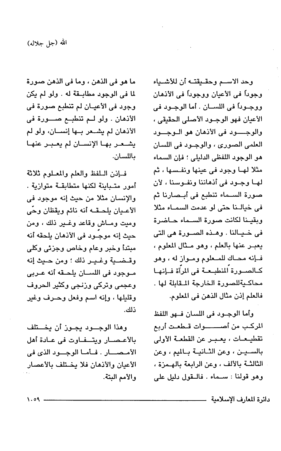 وحد الاسم وحقيقته أن للأشياء وجوداً فى الأعيان ووجوداً فى الأذهان ووجوداً فى اللسان. أما الوجود فى الأعيان فهو الوجود الأصلى الحقيقى، والوجود فى الأذهان هو الوجود العلمى الصورى، والوجود فى اللسان هو الوجود اللفظى الدليلى؛ فإن السماء مثلا لها وجود فى عينها ونفسها، ثم لها وجود فى أذهاننا ونفوسنا، لأن صورة السماء تنطبع فى أبصارنا ثم فى خيالنا حتى لو عدمت السماء مثلا وبقينا لكانت صورة السماء حاضرة فى خيالنا. وهذه الصورة هى التى يعبر عنها بالعلم، وهو مثال المعلوم، فإنه محاكٍ للمعلوم وموازٍ له، وهو كالصورة المنطبعة فى المرآة فإنها محاكية للصورة الخارجة المقابلة لها. فالعلم إذن مثال الذهن فى المعلوم.