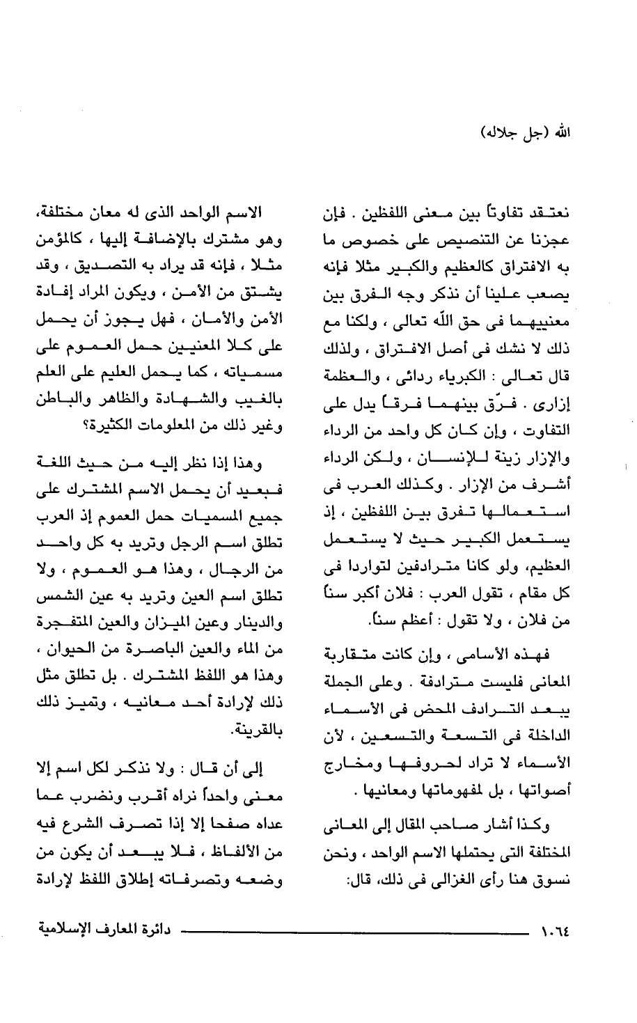 نعتقد تفاوتاً بين معنى اللفظين. فإن عجزنا عن التنصيص على خصوص ما به الافتراق كالعظيم والكبير مثلا فإنه يصعب علينا أن نذكر وجه الفرق بين معنييهما فى حق الله تعالى، ولكنا مع ذلك لا نشك فى أصل الافتراق، ولذلك قال تعالى: الكبرياء ردائى، والعظمة إزارى. فرق بينهما فرقاً يدل على التفاوت، وإن كان كل واحد من الرداء والإزار زينة للإنسان، ولكن الرداء أشرف من الإزار. وكذلك العرب فى استعمالها تفرق بين اللفظين، إذ يستعمل الكبير حيث لا يستعمل العظيم، ولو كانا مترادفين لتواردا فى كل مقام، تقول العرب: فلان أكبر سناً من فلان، ولا تقول: أعظم سناً.
