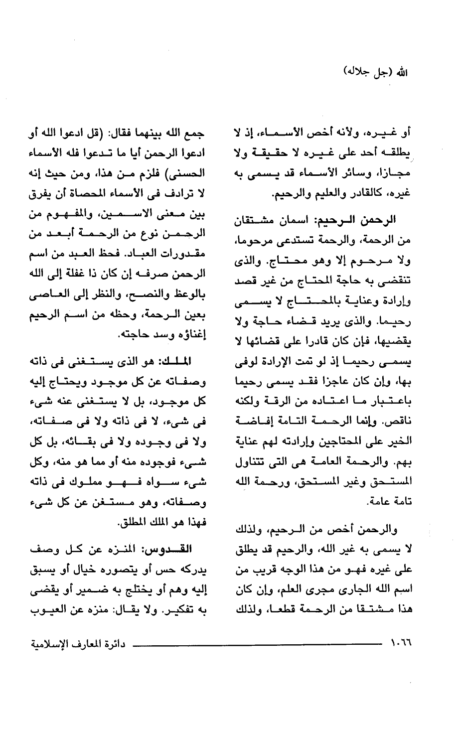 الرحمن الرحيم: اسمان مشتقان من الرحمة، والرحمة تستدعى مرحوما، ولا مرحوم إلا وهو محتاج. والذى تنقضى به حاجة المحتاج من غير قصد وإرادة وعناية بالمحتاج لا يسمى رحيما. والذى يريد قضاء حاجة ولا يقضيها، فإن كان قادرا على قضائها لا يسمى رحيما إذ لو تمت الإرادة لوفى بها، وإن كان عاجزا فقد يسمى رحيما ياعتبار ما اعتاده من الرقة ولكنه ناقص. وإنما الرحمة التامة إفاضة الخير على المحتاجين وإرادته لهم عناية بهم. والرحمة العامة هى التى تتناول المستحق وغير المستحق، ورحمة الله تامة عامة.