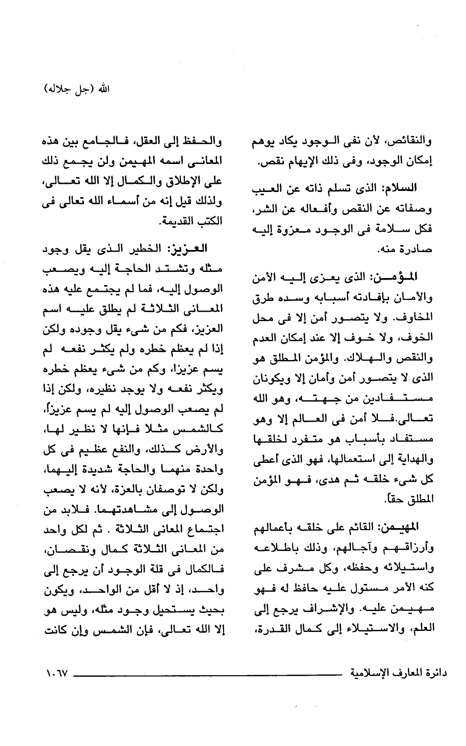 العزيز: الخطير الذى يقل وجود مثله وتشتد الحاجة إليه ويصعب الوصول إليه، فما لم يجتمع عليه هذه المعانى الثلاثة لم يطلق عليه اسم العزيز، فكم من شئ يقل وجوده ولكن إذا لم يعظم خطره ولم يكثر نفعه لم يسم عزيزا، وكم من شئ يعظم خطره ويكثر نفعه ولا يوجد نظيره، ولكن إذا لم يصعب الوصول إليه لم يسم عزيزاً، كالشمس مثلا فإنها لا نظير لها، والأرض كذلك، والنفع عظيم فى كل واحدة منهما والحاجة شديدة إليهما، ولكن لا توصفان بالعزة، لأنه لا يصعب الوصول إلى مشاهدتهما. فلابد من اجتماع المعانى الثلاثة. ثم لكل واحد من المعانى الثلاثة كمال ونقصان، فالكمال فى قلة الوجود أن يرجع إلى واحد، إذ لا أقل من الواحد، ويكون بحيث يستحيل وجود مثله، وليس هو إلا الله تعالى، فإن الشمس وإن كانت