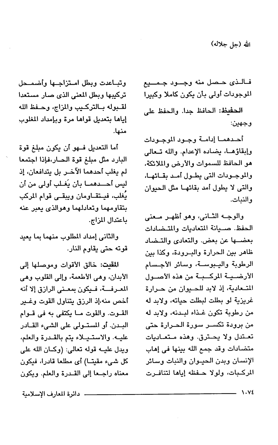 أحدهما إدامة وجود الموجودات وإبقاؤها، يضاده الإعدام. والله تعالى هو الحافظ للسموات والأرض والملائكة، والموجودات التى يطول أمد بقائها، والتى لا يطول أمد بقائها مثل الحيوان والنبات.
