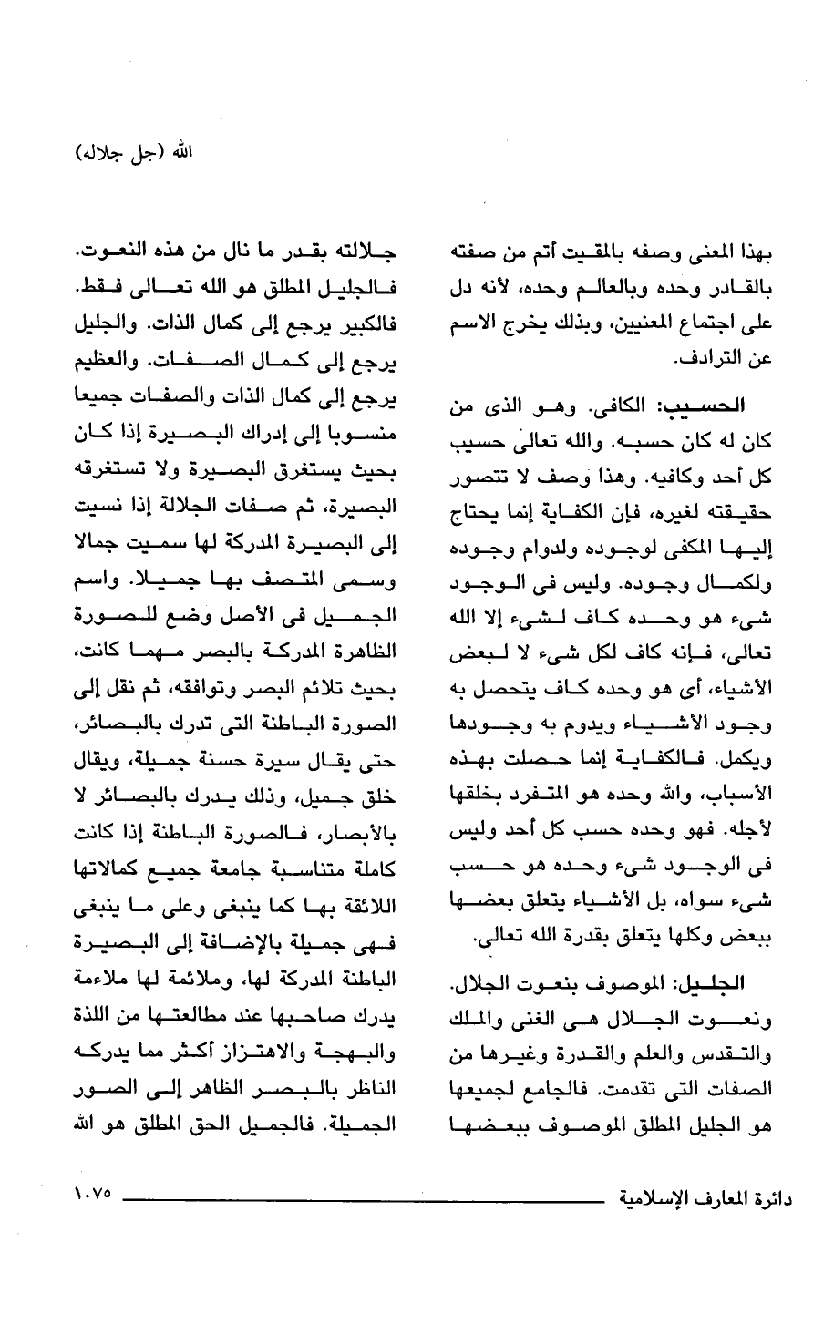 الجليل: الموصوف بنعوت الجلال. ونعوت الجلال هى الغنى والملك والتقدس والعلم والقدرة وغيرها من الصفات التى تقدمت. فالجامع لجميعها هو الجليل المطلق الموصوف ببعضها جلالته بقدر ما نال من هذه النعوت. فالجليل المطلق هو الله تعالى فقط. فالكبير يرجع إلى كمال الذات. والجليل يرجع إلى كمال الصفات. والعظيم يرجع إلى كمال الذات والصفات جميعا منسوبا إلى إدراك البصيرة إذا كان بحيث يستغرق البصيرة ولا تستغرقه البصيرة، ثم صفات الجلالة إذا نسيت إلى البصيرة المدركة لها سميت جمالا وسمى المتصف بها جميلا. واسم الجميل فى الأصل وضع للصورة الظاهرة المدركة بالبصر مهما كانت، بحيث تلائم البصر وتوافقه، ثم نقل إلى الصورة الباطنة التى تدرك بالبصائر، حتى يقال سيرة حسنة جميلة، ويقال خلق جميل، وذلك يدرك بالبصائر لا بالأبصار، فالصورة الباطنة إذا كانت كاملة متناسبة جامعة جميع كمالاتها اللائقة بها كما ينبغى وعلى ما ينبغى فهى جميلة بالإضافة إلى البصيرة الباطنة المدركة لها، وملائمة لها ملاءمة يدرك صاحبها عند مطالعتها من اللذة والبهجة والاهتزاز أكثر مما يدركه الناظر بالبصر الظاهر إلى الصور الجميلة. فالجميل الحق المطلق هو الله