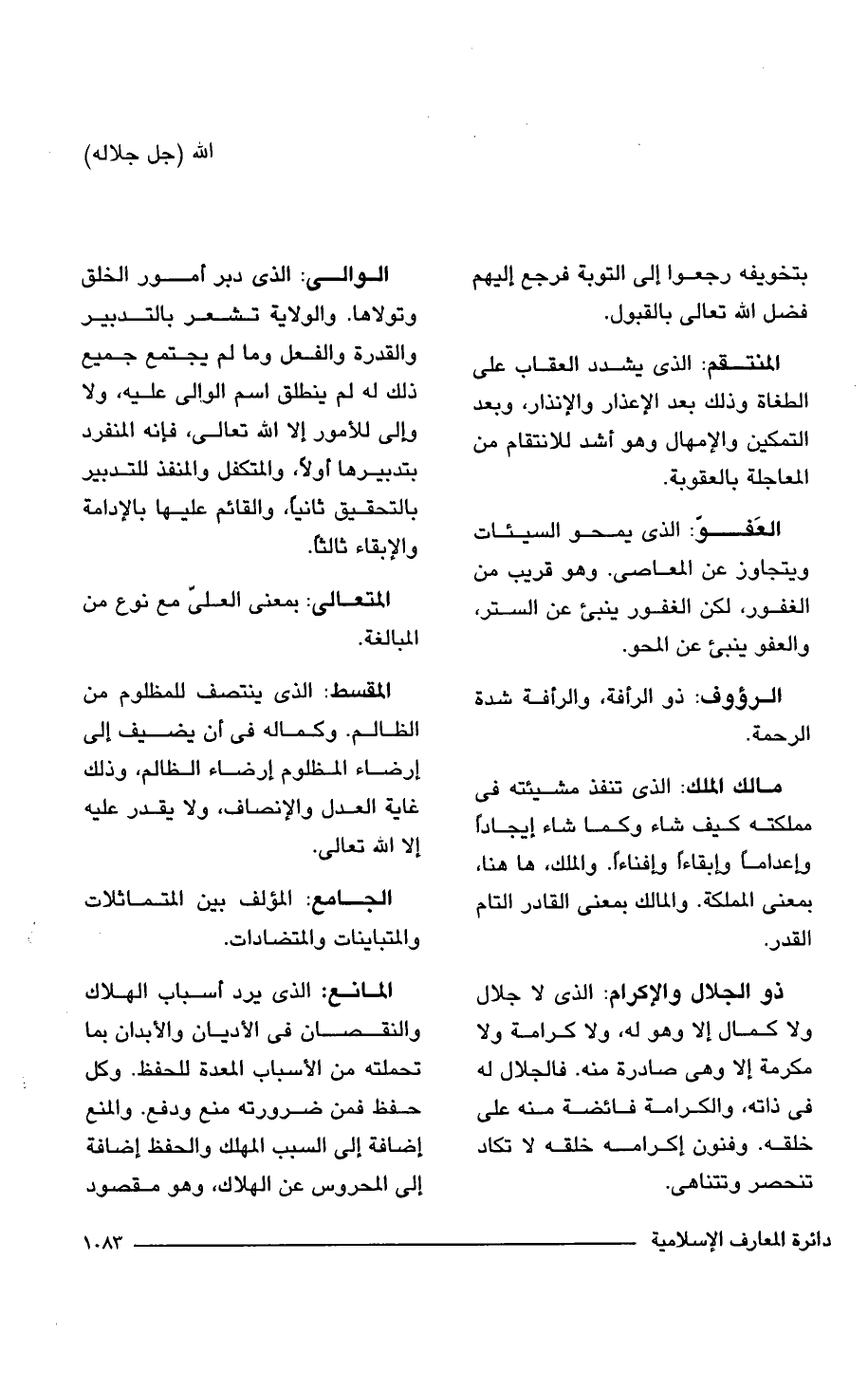 الوالى: الذى دبر أمور الخلق وتولاها. والولاية تشعر بالتدبير والقدرة والفعل وما لم يجتمع جميع ذلك له لم ينطلق اسم الوالى عليه، ولا والى للأمور إلا الله تعالى، فإنه المنفرد بتدبيرها أولاً، والمتكفل والمنفذ للتدبير بالتحقيق ثانياً، والقائم عليها بالإدامة والإبقاء ثالثاً.