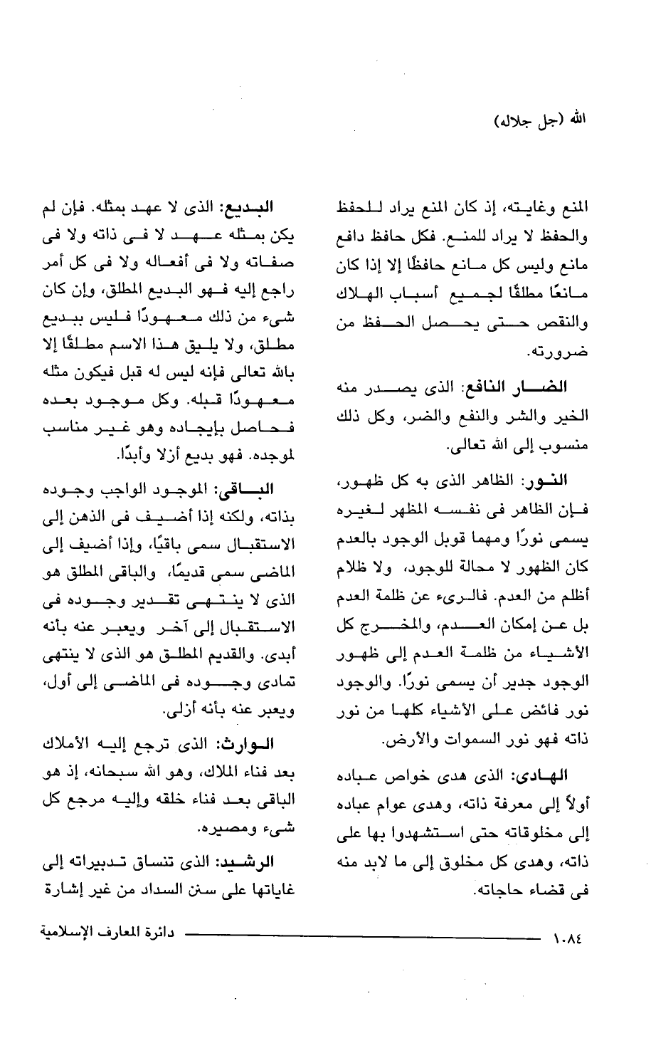 الباقى: الموجود الواجب وجوده بذاته، ولكنه إذا أضيف فى الذهن إلى الاستقبال سمى باقياً، وإذا أضيف إلى الماضى سمى قديماً، والباقى المطلق هو الذى لا ينتهى تقدير وجوده فى الاستقبال إلى آخر ويعبر عنه بأنه أبدى. والقديم المطلق هو الذى لا ينتهى تمادى وجوده فى الماضى إلى أول، ويعبر عنه بأنه أزلى.