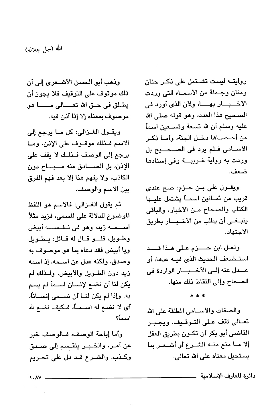 ثم يقول الغزالى: فالاسم هو اللفظ الموضوع للدلالة على المسمى، فزيد مثلاً اسمه زيد، وهو فى نفسه أبيض وطويل، فلو قال له قائل: يطويل ويا أبيض فقد دعاه بما هو موصوف به وصدق، ولكنه عدل عن اسمه، إذ اسمه زيد دون الطويل والأبيض. ولذلك لم يكن لنا أن نضع لإنسان اسماً لم يسم به. وإذا لم يكن لنا أن نسمى إنساناً، أى لا نضع له اسماً، فكيف نضع لله اسماً؟