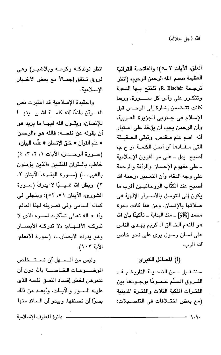 العلق، الآيات 3 - 5)؛ والفاتحة القرآنية العظيمة "بِسْمِ اللَّهِ الرَّحْمَنِ الرَّحِيمِ" (انظر ترجمة R. Blacher (تفتتح بها الدعوة وتتكرر على رأس كل سورة، وربما كانت تتضمن إشارة إلى الرحمن قبل الإسلام فى جنوبى الجزيرة العربية، وأن الرحمن يجب أن يؤخذ على اعتبار أنه اسم علم مقدس. وتبقى الحقيقة التى مفادها أن أصل الكلمة "ر ح م" أصبح يدل - على مر القرون الإسلامية - على مفهوم "الإحسان والرأفة والرحمة على وجه الدقة، وأن التعبير "رحمة الله أصبح عند الكتّاب الروحانيين أقرب ما يكون إلى التوسل بالأسرار الإلهية فى صلاتها بالإنسان. ومن هنا كانت دعوة محمد - صلى الله عليه وسلم - منذ البداية - تأكيداً بأن الله هو المنعم الخالق الكريم يهدى الناس على لسان رسول يرى على نحو خاص أنه الرب.