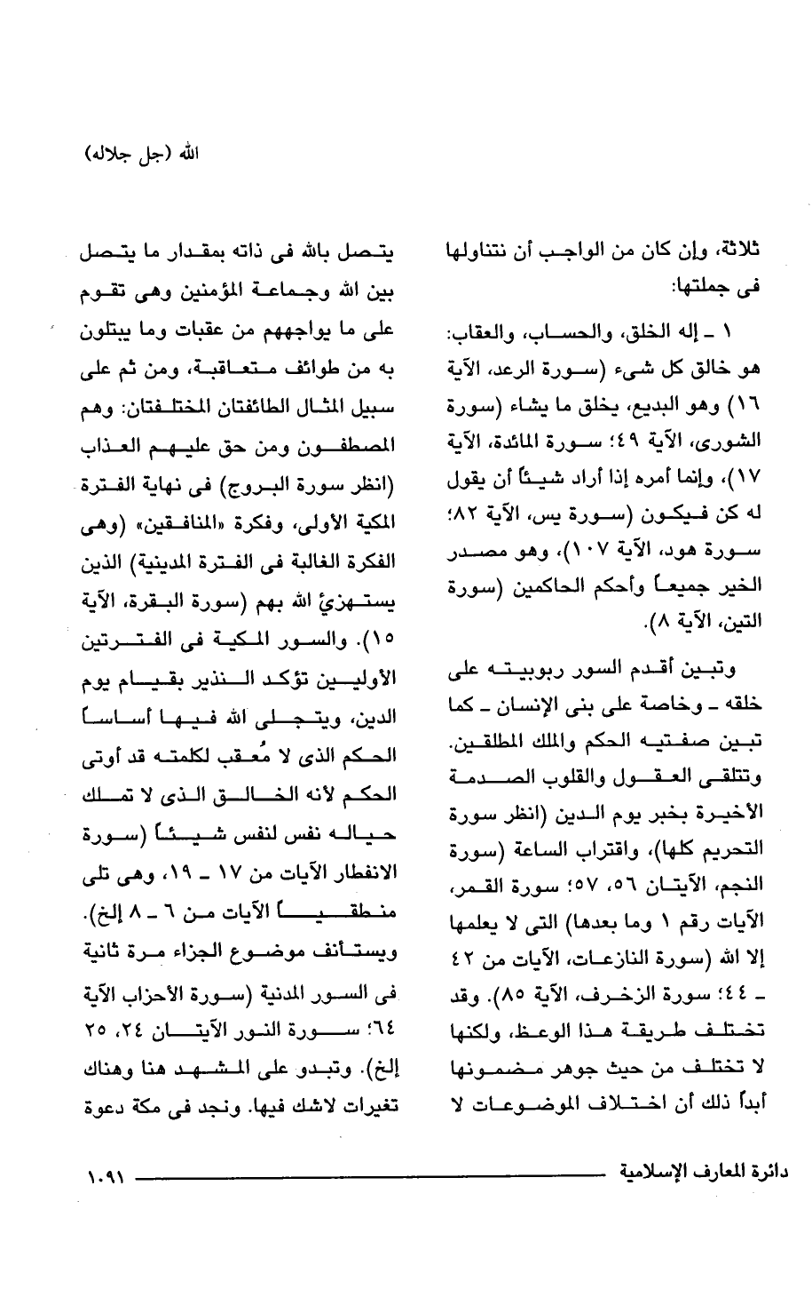 1 - إله الخلق، والحساب، والعقاب: هو خالق كل شئ (سورة الرعد، الآية 16) وهو البديع، يخلق ما يشاء (سورة الشورى، الآية 49؛ سورة المائدة، الآية 17)، وإنما أمره إذا أراد شيئاً أن يقول له كن فيكون (سورة يس، الآية 82؛ سورة هود، الآية 107)، وهو مصدر الخير جميعاً وأحكم الحاكمين (سورة التين، الآية 8).