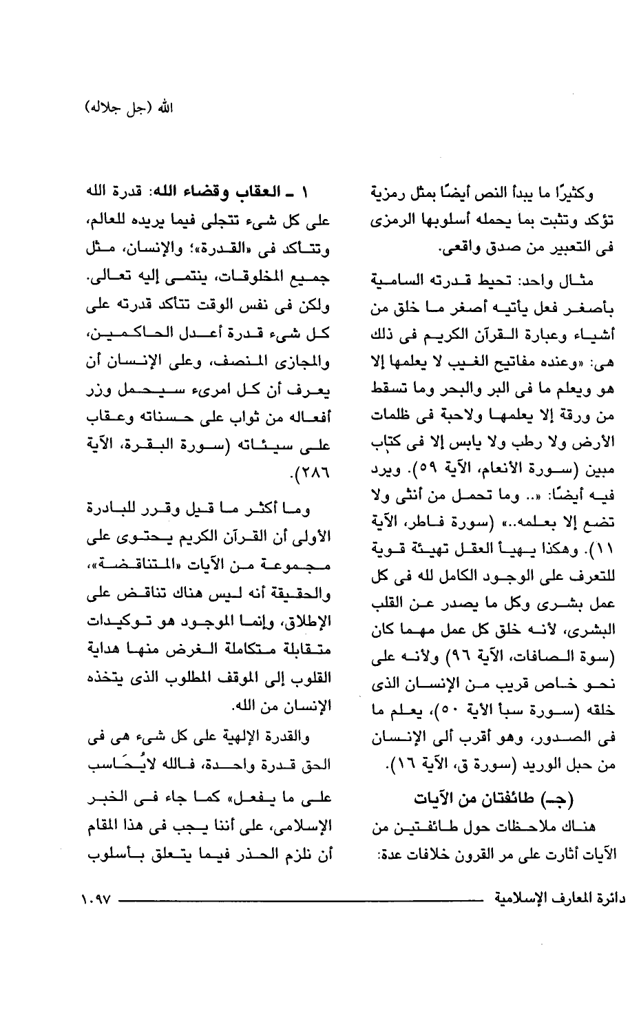 1 - العقاب وقضاء الله: قدرة الله على كل شئ تتجلى فيما يريده للعالم، وتتأكد فى "القدرة"؛ والإنسان، مثل جميع المخلوقات، ينتمى إليه تعالى. ولكن فى نفس الوقت تتأكد قدرته على كل شئ قدرة أعدل الحاكمين، والمجازى المنصف، وعلى الإنسان أن يعرف أن كل امرئ سيحمل وزر أفعاله من ثواب على حسناته وعقاب على سيئاته (سورة البقرة، الآية 286).