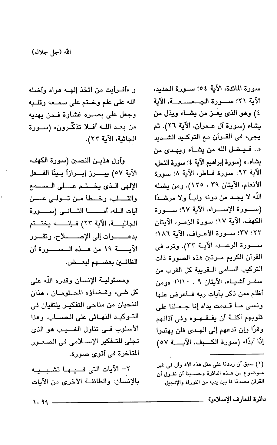 وأول هذين النصين (سورة الكهف، الآية 57) يبرز إبرازاً بيناً الفعل الإلهى الذى يختم على السمع والقلب، وخطأ من تولى عن آيات الله، أما الثانى (سورة الجاثية، الآية 23) فإنه يختتم بدعوات إلى الإصلاح، وتقرر الآية 19 من هذه السورة أن الظالمين بعضهم لبعض.