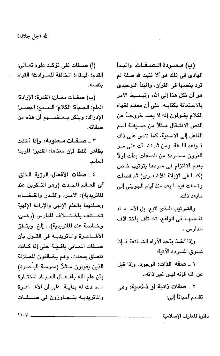 (ب) مسردة الصفات. والمبدأ الهادى فى ذلك هو ألا نثبت لله صفة لم ترد بنصها فى القرآن، والمبدأ التوحيدى هو أن نكل هذا إلى الله، وتبسيط الأمر بالاستعانة بكتابه. على أن معظم فقهاء الكلام يقولون إنه لا يعد خروجاً عن النص الانتقال مثلاً من صيغة اسم الفاعل إلى الاسمية، كما تنص على ذلك قواعد اللغة. ومن ثم نشأت على مر القرون مسردة من الصفات بدأت أولاً بعدم الالتزام فى سردها بترتيب خاص (كما فى الإبانة للأشعرى) ثم فصلت ونسقت فيما بعد منذ أيام الجوينى إلى ما بعد ذلك.