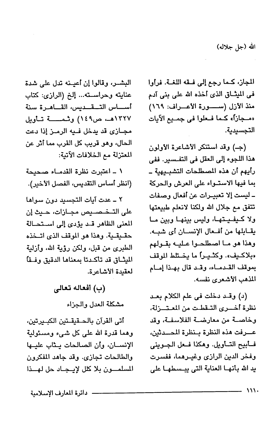 2 - عدت آيات التجسيد دون سواها على التخصيص مجازات، حيث إن المعنى الظاهر قد يؤدى إلى استحالة حقيقية. وهذا هو الموقف الذى اتخذه الطبرى من قبل، ولكن رؤية الله، وأزلية الميثاق قد تأكدتا بمعناها الدقيق وفقاً لعقيدة الأشاعرة.