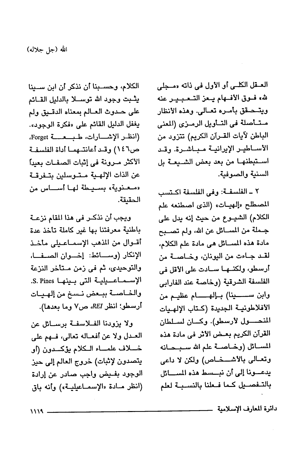 2 - الفلسفة: وفى الفلسفة اكتسب المصطلح "إلهيات" (الذى اصطنعه علم الكلام) الشيوع من حيث إنه يدل على جملة من المسائل عن الله، ولم تصبح مادة هذه المسائل هى مادة علم الكلام، لقد جاءت من اليونان، وخاصة من أرسطو، ولكنها سادت على الأقل فى الفلسفة الشرقية (وخاصة عند الفارابى وابن سينا) بإلهام عظيم من الأفلاطونية الجديدة (كتاب الإلهيات المنحول لأرسطو). وكان لسلطان القرآن الكريم بعض الأثر فى مادة هذه المسائل (وخاصة علم الله سبحانه وتعالى بالأشخاص) ولكن لا داعى يدعونا إلى أن نبسط هذه المسائل بالتفصيل كما فعلنا بالنسبة لعلم الكلام، وحسبنا أن نذكر أن ابن سينا يثبت وجود الله توسلا بالدليل القائم على حدوث العالم بمعناه الدقيق ولم يغفل الدليل القائم على "فكرة الوجود". (انظر الإشارات، طبعة Forget. ص 146) وقد أعانتهما أداة الفلسفة الأكثر مرونة فى إثبات الصفات بعيداً عن الذات الإلهية متوسلين بتفرقة "معنوية" بسيطة لها أساس من الحقيقة.