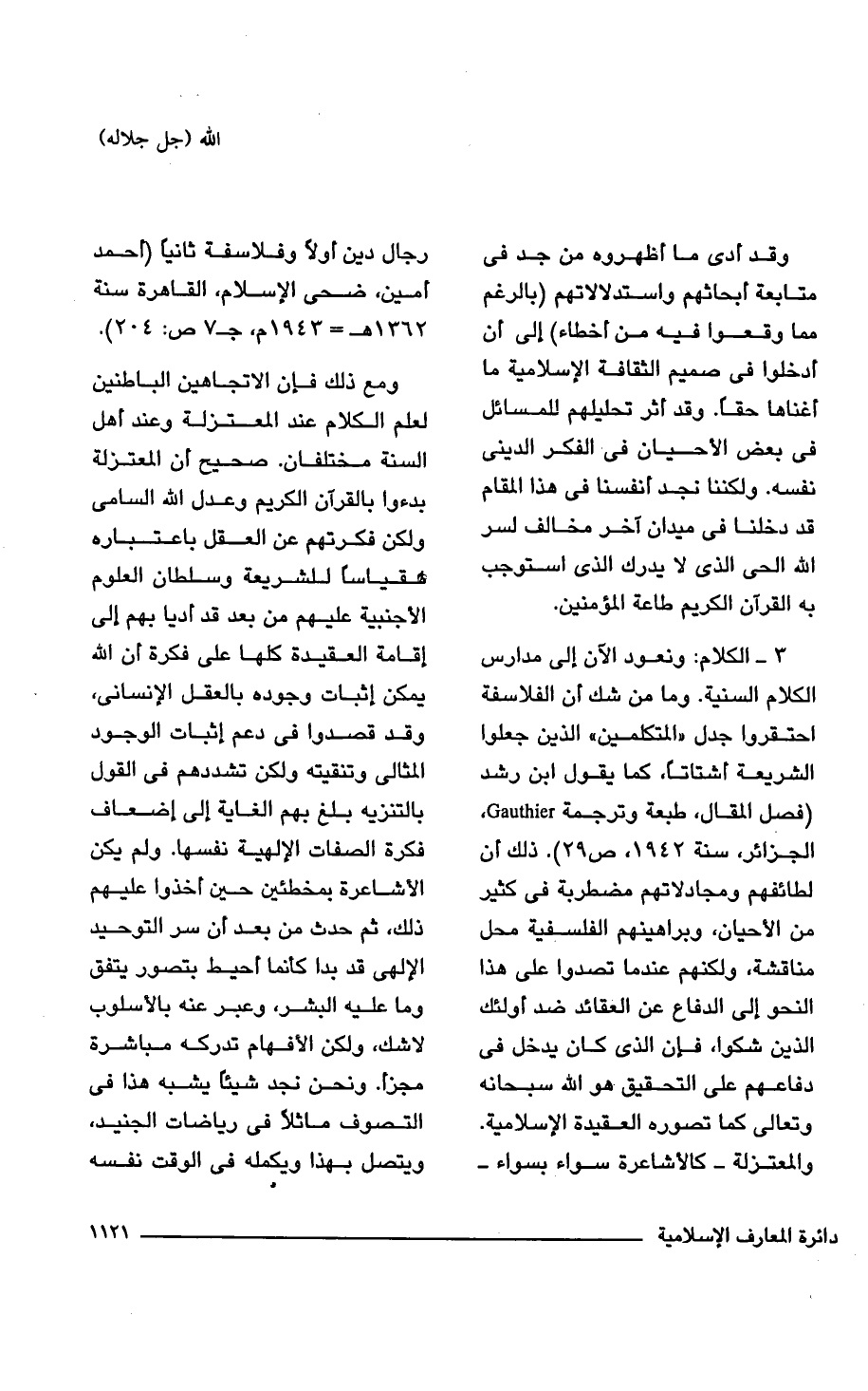 3 - الكلام: ونعود الآن إلى مدارس الكلام السنية. وما من شك أن الفلاسفة احتقروا جدل "المتكلمين" الذين جعلوا الشريعة أشتاتاً، كما يقول ابن رشد (فصل المقال، طبعة وترجمة Gauthier، الجزائر، سنة 1942، ص 29). ذلك أن لطائفهم ومجادلاتهم مضطربة فى كثير من الأحيان، وبراهينهم الفلسفية محل مناقشة، ولكنهم عندما تصدوا على هذا النحو إلى الدفاع عن العقائد ضد أولئك الذين شكوا، فإن الذى كان يدخل فى دفاعهم على التحقيق هو الله سبحانه وتعالى كما تصوره العقيدة الإسلامية. والمعتزلة -كالأشاعرة سواء بسواء- رجال دين أولاً وفلاسفة ثانياً (أحمد أمين، ضحى الإسلام، القاهرة سنة 1362 هـ = 1943 م، جـ 7 ص: 204).