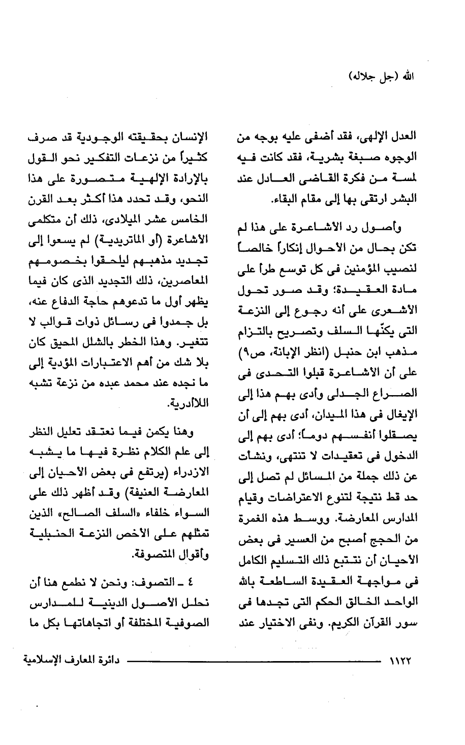 وأصول رد الأشاعرة على هذا لم تكن بحال من الأحوال إنكاراً خالصاً لنصيب المؤمنين فى كل توسع طرأ على مادة العقيدة؛ وقد صور تحول الأشعرى على أنه رجوع إلى النزعة التى يكنها السلف وتصريح بالتزام مذهب ابن حنبل (انظر الإبانة، ص 9) على أن الأشاعرة قبلوا التحدى فى الصراع الجدلى وأدى بهم هذا إلى الإيغال فى هذا الميدان، أدى بهم إلى أن يصقلوا أنفسهم دوماً؛ أدى بهم إلى الدخول فى تعقيدات لا تنتهى، ونشأت عن ذلك جملة من المسائل لم تصل إلى حد قط نتيجة لتنوع الاعتراضات وقيام المدارس المعارضة. ووسط هذه الغمرة من الحجج أصبح من العسير فى بعض الأحيان أن نتتبع ذلك التسليم الكامل فى مواجهة العقيدة الساطعة بالله الواحد الخالق الحكم التى تجدها فى سور القرآن الكريم. ونفى الاختيار عند الإنسان بحقيقته الوجودية قد صرف كثيراً من نزعات التفكير نحو القول بالإرادة الإلهية متصورة على هذا النحو، وقد تحدد هذا أكثر بعد القرن الخامس عشر الميلادى، ذلك أن متكلمى الأشاعرة (أو الماتريدية) لم يسعوا إلى تجديد مذهبهم ليلحقوا بخصومهم المعاصرين، ذلك التجديد الذى كان فيما يظهر أول ما تدعوهم حاجة الدفاع عنه، بل جمدوا فى رسائل ذوات قوالب لا تتغير. وهذا الخطر بالشلل المحيق كان بلا شك من أهم الاعتبارات المؤدية إلى ما نجده عند محمد عبده من نزعة تشبه اللاأدرية.