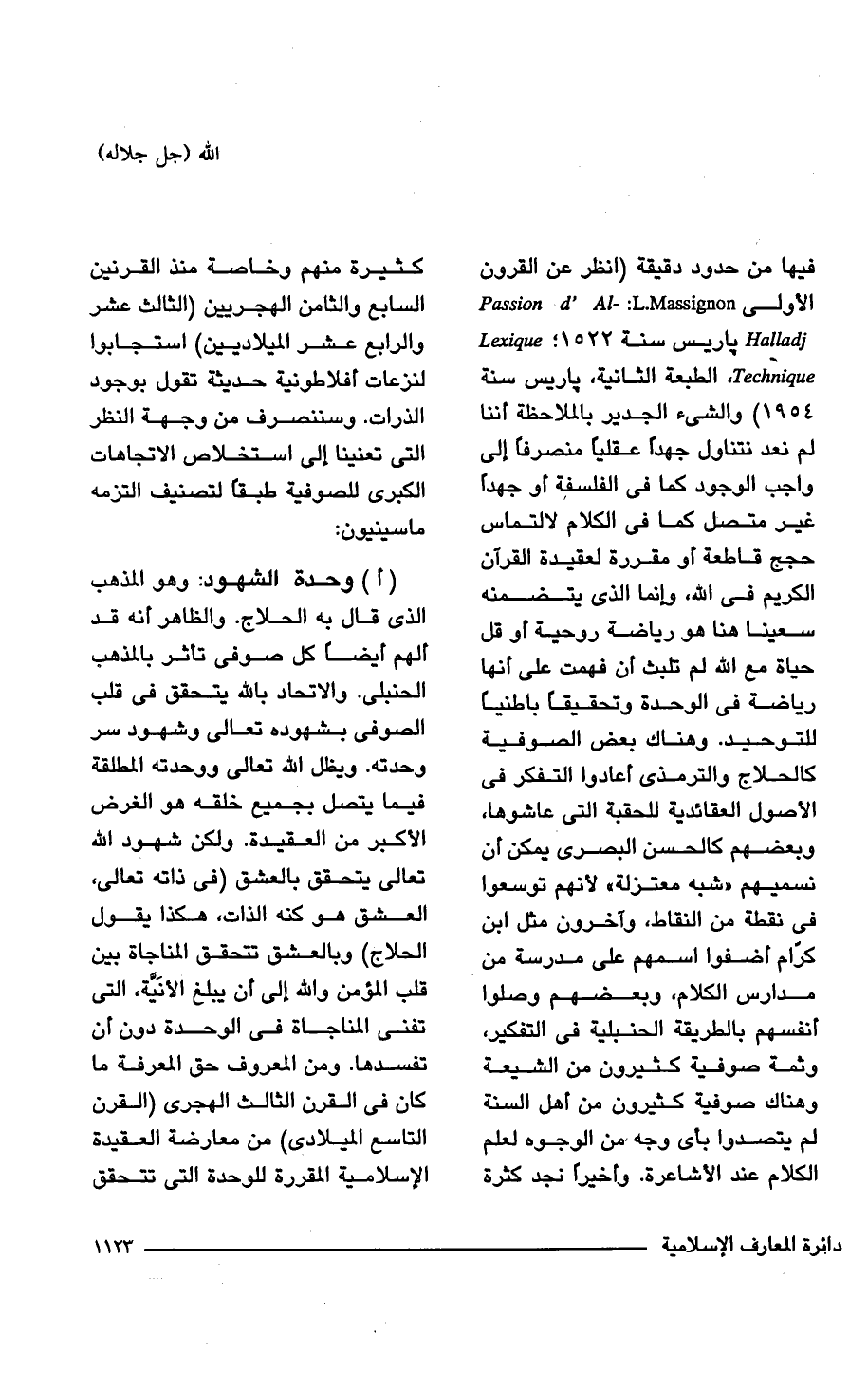 فيها من حدود دقيقة (انظر عن القرون الأولى Passion d' Al-: L.Massignon Halladj باريس سنة 1522؛ Lexique Technique، الطبعة الثانية، باريس سنة 1954) والشئ الجدير بالملاحظة أننا لم نعد نتناول جهداً عقلياً منصرفاً إلى واجب الوجود كما فى الفلسفة أو جهداً غير متصل كما فى الكلام لالتماس حجج قاطعة أو مقررة لعقيدة القرآن الكريم فى الله، وإنما الذى يتضمنه سعينا هنا هو رياضة روحية أو قل حياة مع الله لم تلبث أن فهمت على أنها رياضة فى الوحدة وتحقيقاً باطنياً للتوحيد. وهناك بعض الصوفية كالحلاج والترمذى أعادوا التفكر فى الأصول العقائدية للحقبة التى عاشوها، وبعضهم كالحسن البصرى يمكن أن نسميهم "شبه معتزلة" لأنهم توسعوا فى نقطة من النقاط، وآخرون مثل ابن كرام أضفوا اسمهم على مدرسة من مدارس الكلام، وبعضهم وصلوا أنفسهم بالطريقة الحنبلية فى التفكير، وثمة صوفية كثيرون من الشيعة وهناك صوفية كثيرون من أهل السنة لم يتصدوا بأى وجه من الوجوه لعلم الكلام عند الأشاعرة. وأخيراً نجد كثرة كثيرة منهم وخاصة منذ القرنين السابع والثامن الهجريين (الثالث عشر والرابع عشر الميلاديين) استجابوا لنزعات أفلاطونية حديثة تقول بوجود الذرات. وسننصرف من وجهة النظر التى تعنينا إلى استخلاص الاتجاهات الكبرى للصوفية طبقاً لتصنيف التزمه