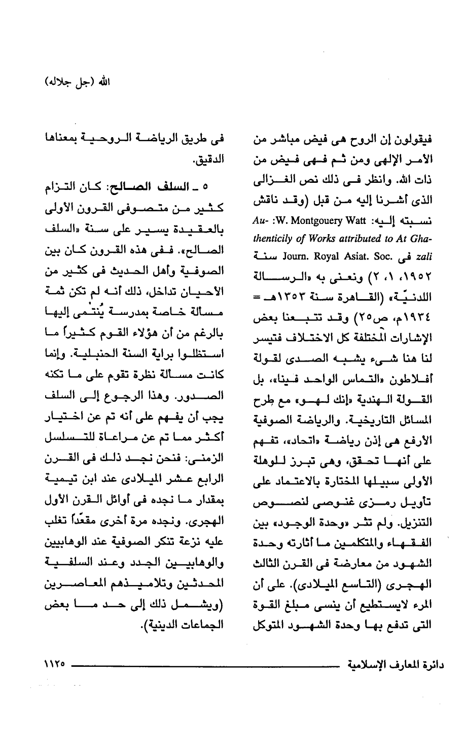 فيقولون إن الروح هى فيض مباشر من الأمر الإلهى ومن ثم فهى فيض من ذات الله. وانظر فى ذلك نص الغزالى الذى أشرنا إليه من قبل (وقد ناقش نسبته إليه: Au-: W. Montgouery Watt -thenticily of Works attributed to At Gha zali فى. Royal Asiat. Soc .Journ سنة 1952، 1، 2) ونعنى به "الرسالة اللدنيّة" (القاهرة سنة 1353 هـ = 1934 م، ص 25) وقد تتبعنا بعض الإشارات المختلفة كل الاختلاف فتيسر لنا هنا شئ يشبه الصدى لقولة أفلاطون "التماس الواحد فينا"، بل القولة الهندية "إنك لهو" مع طرح المسائل التاريخية. والرياضة الصوفية الأرفع هى إذن رياضة "اتحاد"، تفهم على أنها تحقق، وهى تبرز للوهلة الأولى سبيلها المختارة بالاعتماد على تأويل رمزى غنوصى لنصوص التنزيل. ولم تثر "وحدة الوجود" بين الفقهاء والمتكلمين ما أثارته وحدة الشهود من معارضة فى القرن الثالث الهجرى (التاسع الميلادى). على أن المرء لا يستطيع أن ينسى مبلغ القوة التى تدفع بها وحدة الشهود المتوكل فى طريق الرياضة الروحية بمعناها الدقيق.