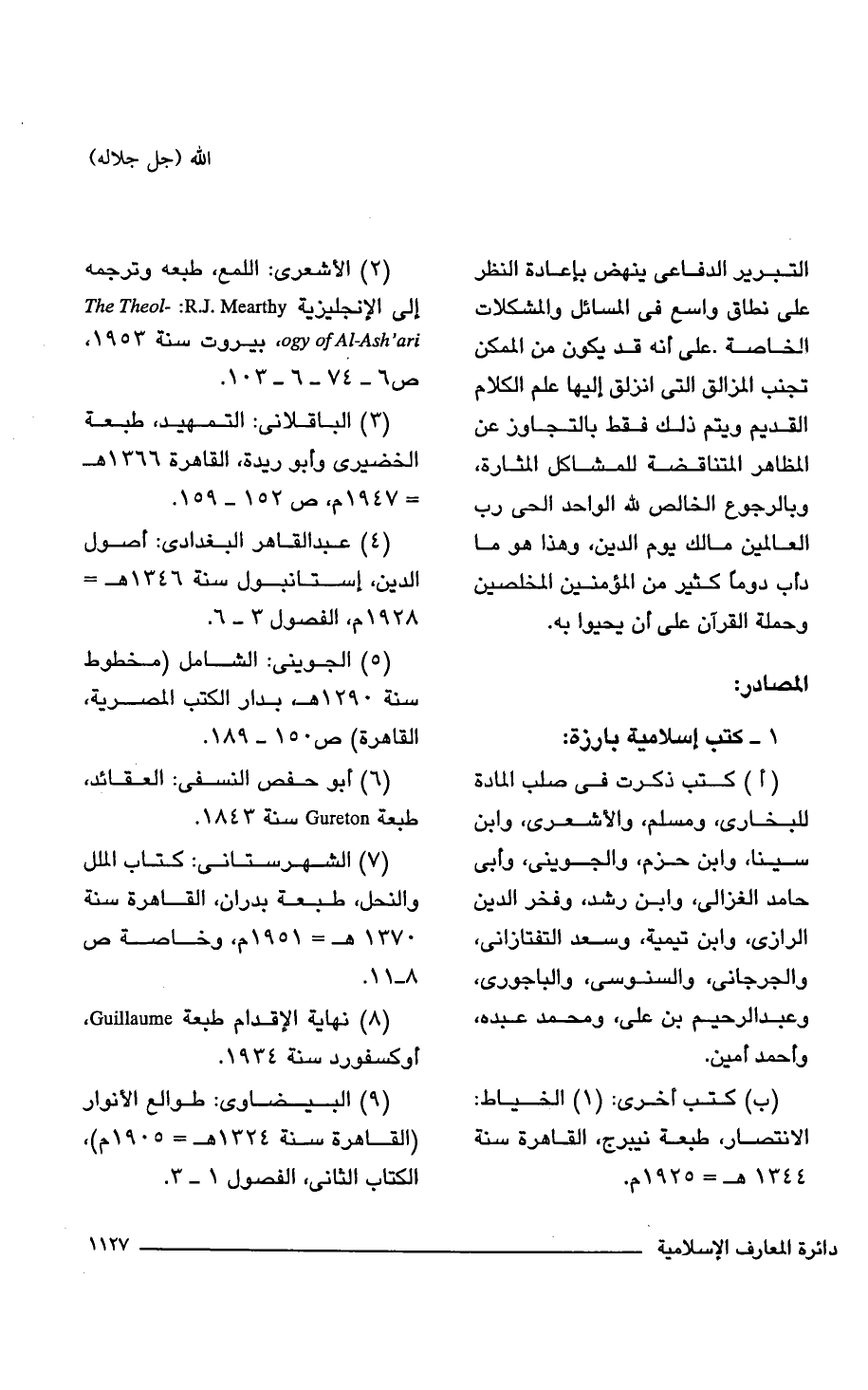(أ) كتب ذكرت فى صلب المادة للبخارى، ومسلم، والأشعرى، وابن سينا، وابن حزم، والجوينى، وأبى حامد الغزالى، وابن رشد، وفخر الدين الرازى، وابن تيمية، وسعد التفتازانى، والجرجاني، والسنوسى، والباجورى، وعبد الرحيم بن على، ومحمد عبده، وأحمد أمين.