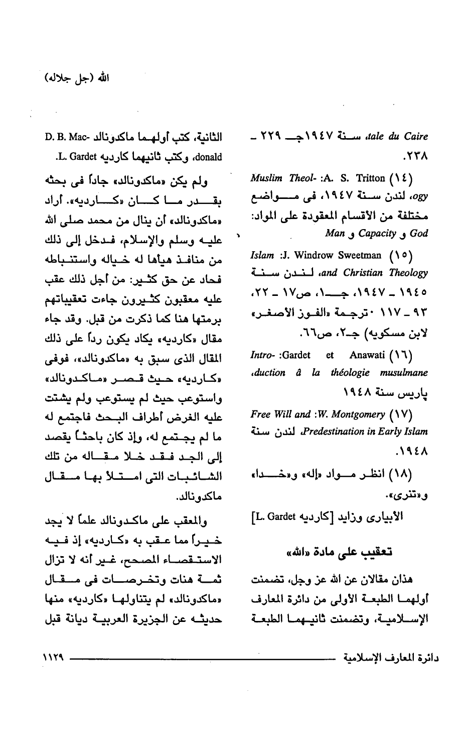 (14) Muslim Theol-: A. S. Tritton ogy، لندن سنة 1947، فى مواضع مختلفة من الأقسام المعقودة على المواد: God و Capacity و Man