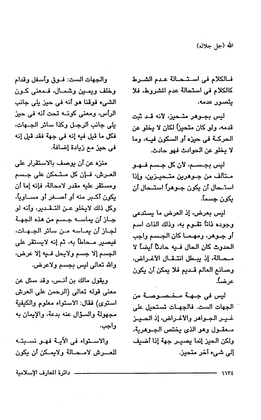 ليس فى جهة مخصوصة من الجهات الست. فالجهات تستحيل على غير الجواهر والأغراض، إذ الحيز معقول وهو الذى يختص الجوهرية، ولكن الحيز إنما يصير جهة إذا أضيف إلى شئ آخر متحيز.