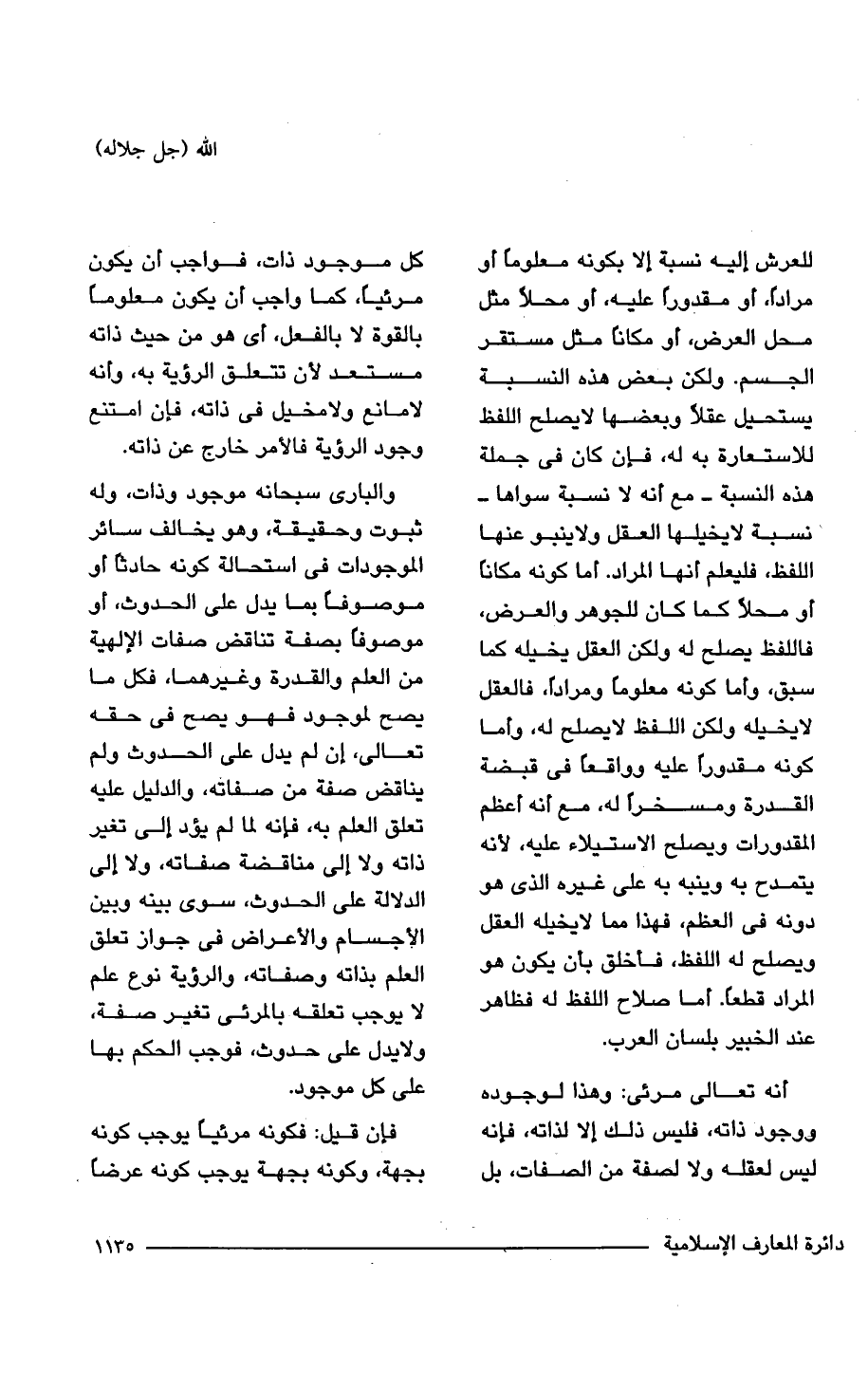 والبارى سبحانه موجود وذات، وله ثبوت وحقيقة، وهو يخالف سائر الموجودات فى استحالة كونه حادثاً أو موصوفاً بما يدل على الحدوث، أو موصوفاً بصفة تناقض صفات الإلهية من العلم والقدرة وغيرهما، فكل ما يصح لموجود فهو يصح فى حقه تعالى، إن لم يدل على الحدوث ولم يناقض صفة من صفاته، والدليل عليه تعلق العلم به، فإنه لما لم يؤد إلى تغير ذاته ولا إلى مناقضة صفاته، ولا إلى الدلالة على الحدوث، سوى بينه وبين الأجسام والأعراض فى جواز تعلق العلم بذاته وصفاته، والرؤية نوع علم لا يوجب تعلقه بالمرئى تغير صفة، ولا يدل على حدوث، فوجب الحكم بها على كل موجود.