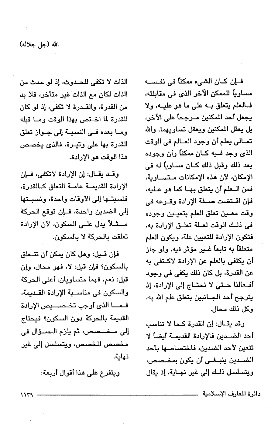 فإن كان الشئ ممكناً فى نفسه مساوياً للممكن الآخر الذى فى مقابلته، فالعلم يتعلق به على ما هو عليه، ولا يجعل أحد الممكنين مرجحاً على الآخر، بل يعقل الممكنين ويعقل تساويهما. والله تعالى يعلم أن وجود العالم فى الوقت الذى وجد فيه كان ممكناً وأن وجوده بعد ذلك وقبل ذلك كان مساوياً له فى الإمكان، لأن هذه الإمكانات متساوية، فمن العلم أن يتعلق بها كما هو عليه، فإن اقتضت صفة الإرادة وقوعه فى وقت معين تعلق العلم بتعيين وجوده فى ذلك الوقت لعلة تعلق الإرادة به، فتكون الإرادة للتعيين علة، ويكون العلم متعلقاً به تابعاً غير مؤثر فيه، ولو جاز أن يكتفى بالعلم عن الإرادة لاكتفى به عن القدرة، بل كان ذلك يكفى فى وجود أفعالنا حتى لا نحتاج إلى الإرادة، إذ يترجح أحد الجانبين بتعلق علم الله به، وكل ذلك محال.