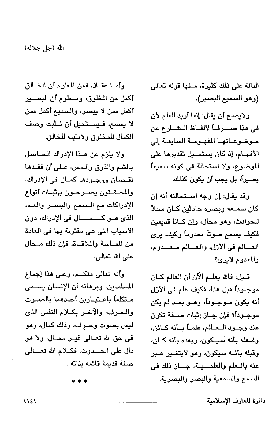 وأنه تعالى متكلم، وعلى هذا إجماع المسلمين. وبرهانه أن الإنسان يسمى متكلماً باعتبارين أحدهما بالصوت والحرف، والآخر بكلام النفس الذى ليس بصوت وحرف، وذلك كمال، وهو فى حق الله تعالى غير محال، ولا هو دال على الحدوث، فكلام الله تعالى صفة قديمة قائمة بذاته.