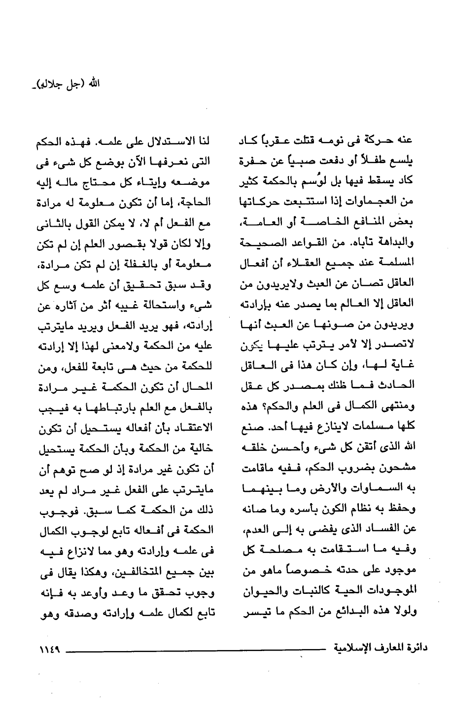 عنه حركة فى نومه قتلت عقرباً كاد يلسع طفلاً أو دفعت صبياً عن حفرة كاد يسقط فيها بل لوُسم بالحكمة كثير من العجماوات إذا استتبعت حركاتها بعض المنافع الخاصة أو العامة، والبداهة تأباه. من القواعد الصحيحة المسلمة عند جميع العقلاء أن أفعال العاقل تصان عن العبث ولا يريدون من العاقل إلا العالم بما يصدر عنه بإرادته ويريدون من صونها عن العبث أنها لاتصدر إلا لأمر يترتب عليها يكون غاية لها، وإن كان هذا فى العاقل الحادث فما ظنك بمصدر كل عقل ومنتهى الكمال فى العلم والحكم؟ هذه كلها مسلمات لا ينازع فيها أحد. صنع الله الذى أتقن كل شئ وأحسن خلقه مشحون بضروب الحكم، ففيه ماقامت به السماوات والأرض وما بينهما وحفظ به نظام الكون بأسره وما صانه عن الفساد الذى يفضى به إلى العدم، وفيه ما استقامت به مصلحة كل موجود على حدته خصوصاً ما هو من الموجودات الحية كالنبات والحيوان ولولا هذه البدائع من الحكم ما تيسر لنا الاستدلال على علمه. فهذه الحكم التى نعرفها الآن بوضع كل شئ فى موضعه وإيتاء كل محتاج ماله إليه الحاجة، إما أن تكون معلومة له مرادة مع الفعل أم لا، لا يمكن القول بالثانى وإلا لكان قولا بقصور العلم إن لم تكن معلومة أو بالغفلة إن لم تكن مرادة، وقد سبق تحقيق أن علمه وسع كل شئ واستحالة غيبه أثر من آثاره عن إرادته، فهو يريد الفعل ويريد ما يترتب عليه من الحكمة ولا معنى لهذا إلا إرادته للحكمة من حيث هى تابعة للفعل، ومن المحال أن تكون الحكمة غير مرادة بالفعل مع العلم بارتباطها به فيجب الاعتقاد بأن أفعاله يستحيل أن تكون خالية من الحكمة وبأن الحكمة يستحيل أن تكون غير مرادة إذ لو صح توهم أن ما يترتب على الفعل غير مراد لم يعد ذلك من الحكمة كما سبق. فوجوب الحكمة فى أفعاله تابع لوجوب الكمال فى علمه وإرادته وهو مما لا نزاع فيه بين جميع المتخالفين، وهكذا يقال فى وجوب تحقق ما وعد وأوعد به فإنه تابع لكمال علمه وإرادته وصدقه وهو