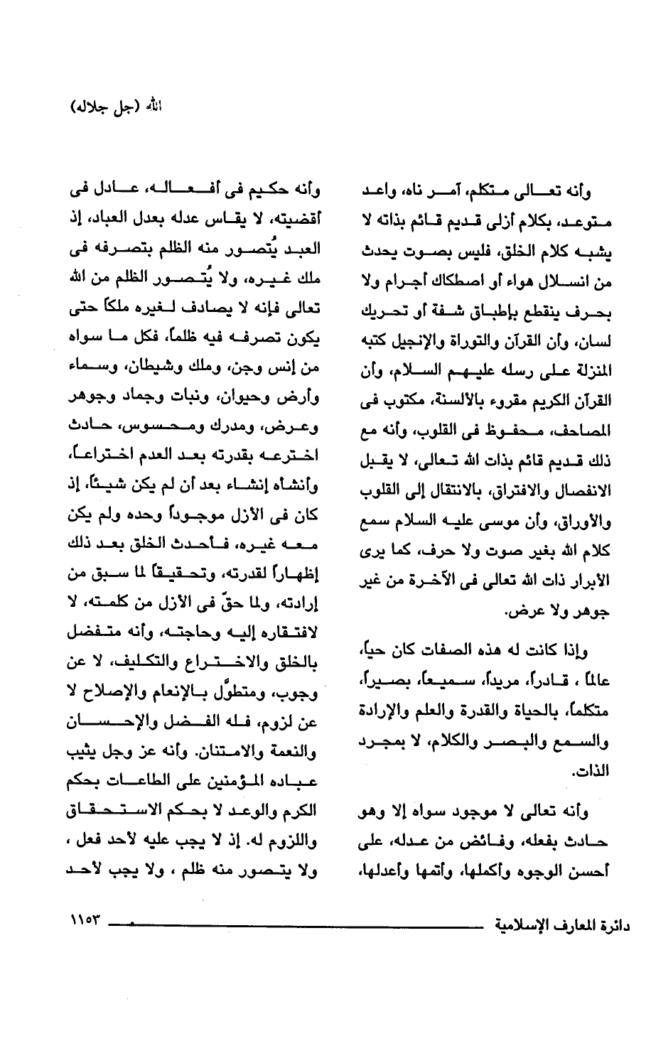 وأنه تعالى متكلم، آمر ناه، واعد متوعد، بكلام أزلى قديم قائم بذاته لا يشبه كلام الخلق، فليس بصوت يحدث من انسلال هواء أو اصطكاك أجرام ولا بحرف ينقطع بإطباق شفة أو تحريك لسان، وأن القرآن والتوراة والإنجيل كتبه المنزلة على رسله عليهم السلام، وإن القرآن الكريم مقروء بالألسنة، مكتوب فى المصاحف، محفوظ فى القلوب، وأنه مع ذلك قديم قائم بذات الله تعالى، لا يقبل الانفصال والافتراق، بالانتقال إلى القلوب والأوراق، وأن موسى عليه السلام سمع كلام الله بغير صوت ولا حرف، كما يرى الأبرار ذات الله تعالى فى الآخرة من غير جوهر ولا عرض.