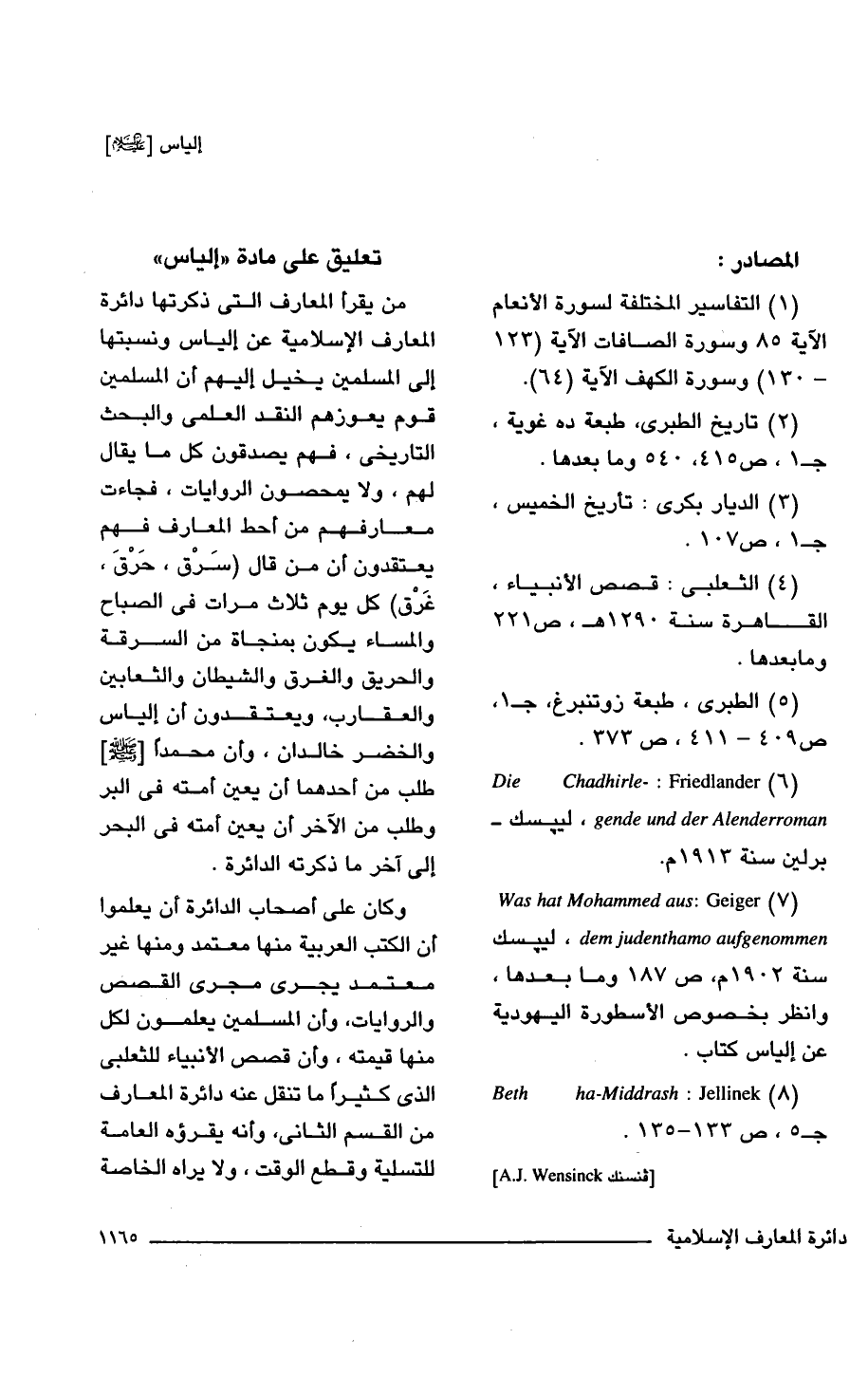 من يقرأ المعارف التى ذكرتها دائرة المعارف الإسلامية عن إلياس ونسبتها إلى المسلمين يخيل إليهم أن المسلمين قوم يعوزهم النقد العلمى والبحث التاريخى، فهم يصدقون كل ما يقال لهم، ولا يمحصون الروايات، فجاءت معارفهم من أحط المعارف فهم يعتقدون أن من قال (سَرْق، حَرْقَ، غَرْق) كل يوم ثلاث مرات فى الصباح والمساء يكون بمنجاة من السرقة والحريق والغرق والشيطان والثعابين والعقارب، ويعتقدون أن إلياس والخضر خالدان، وأن محمداً [- صلى الله عليه وسلم -] طلب من أحدهما أن يعين أمته فى البر وطلب من الآخر أن يعين أمته فى البحر إلى آخر ما ذكرته الدائرة.