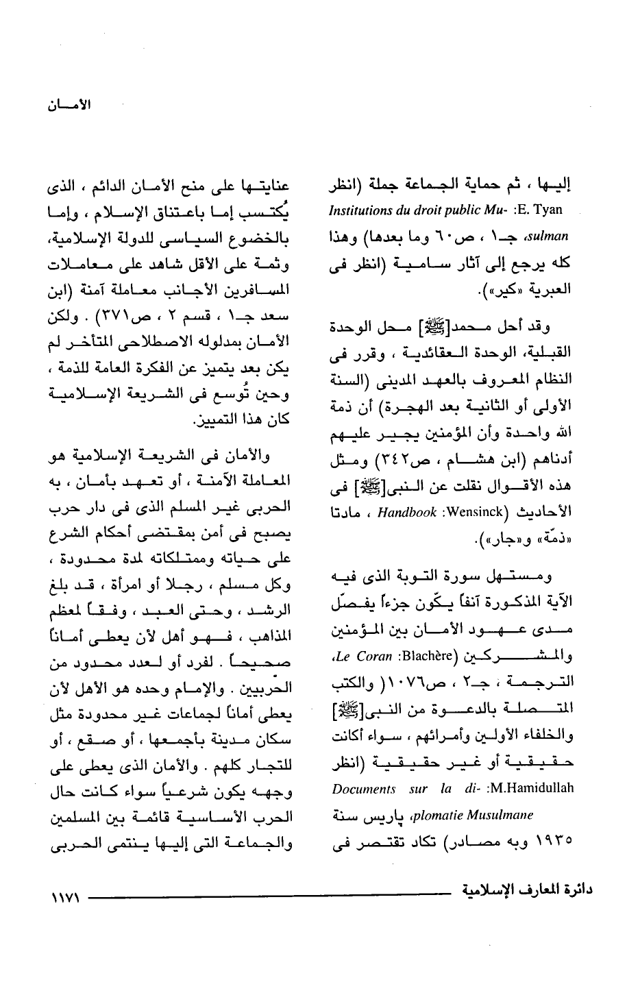 ومستهل سورة التوبة الذى فيه الآية المذكورة آنفاً يكّون جزءاً يفصّل مدى عهود الأمان بين المؤمنين والمشركين (Le Coran: Blachere, الترجمة، جـ 2، ص 1076 (والكتب المتصلة بالدعوة من النبى [- صلى الله عليه وسلم -] والخلفاء الأولين وأمرائهم، سواء أكانت حقيقية أو غير حقيقية (انظر Documents sur la di-: M.Hamidullah plomatie Musulmane باريس سنة 1935 وبه مصادر) تكاد تقتصر فى عنايتها على منح الأمان الدائم، الذى يُكتسب إما باعتناق الإسلام، وإما بالخضوع السياسى للدولة الإسلامية، وثمة على الأقل شاهد على معاملات المسافرين الأجانب معاملة آمنة (ابن سعد جـ 1، قسم 2، ص 371). ولكن الأمان بمدلوله الاصطلاحى المتأخر لم يكن بعد يتميز عن الفكرة العامة للذمة، وحين تُوسع فى الشريعة الإسلامية كان هذا التمييز.