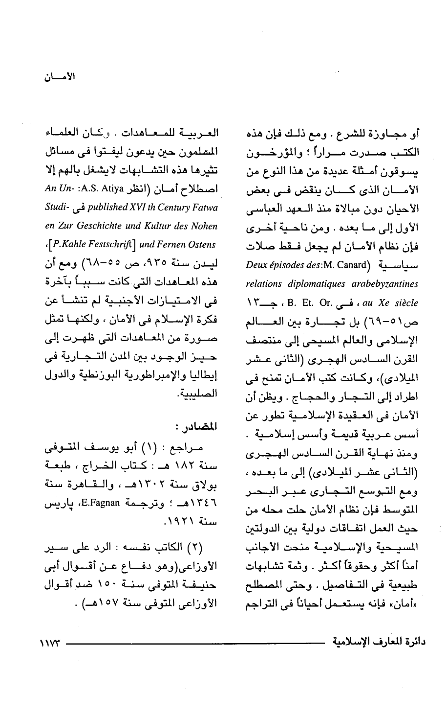 مراجع: (1) أبو يوسف المتوفى سنة 182 هـ: كتاب الخراج، طبعة بولاق سنة 1302 هـ، والقاهرة سنة 1346 هـ؛ وترجمة E.Fagnan، باريس سنة 1921.