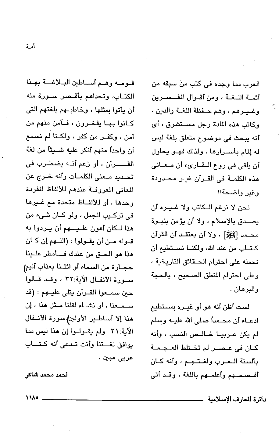 العرب مما وجده فى كتب من سبقه من أئمة اللغة، ومن أقوال المفسرين وغيرهم، وهم حفظة اللغة والدين، وكاتب هذه المادة رجل مستشرق، أى أنه يبحث فى موضوع متعلق بلغة ليس له إلمام بأسرارها، ولذلك فهو يحاول أن يلقى فى روع القارئ أن معانى هذه الكلمة فى القرآن غير محدودة وغير واضحة! !